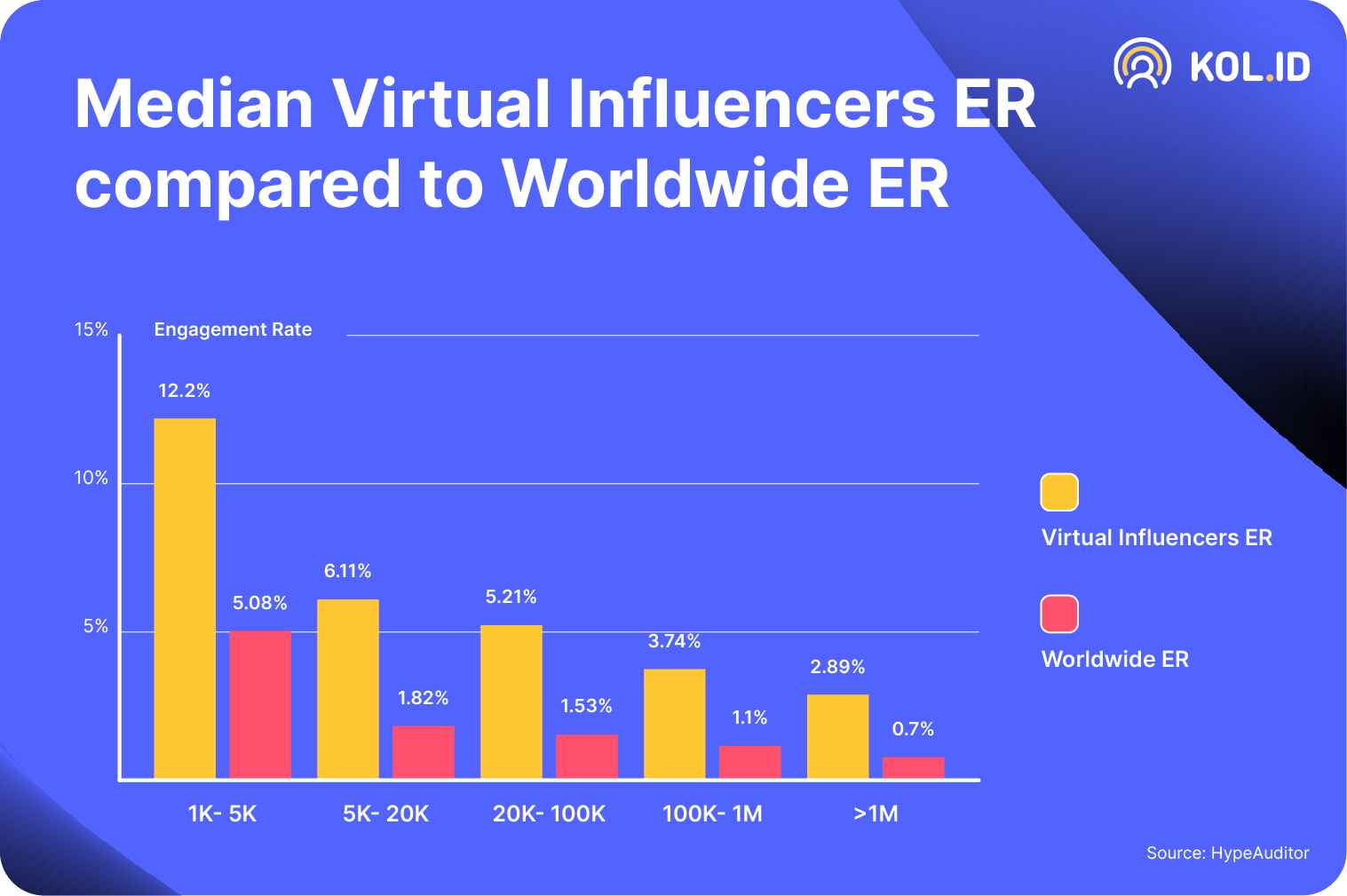 Data dari HypeAuditor mengungkapkan bahwa influencer dengan pengikut yang lebih dari 1M, memiliki engagement rate sebesar 2,89%, sementara influencer manusia hanya sekitar 0.7%.