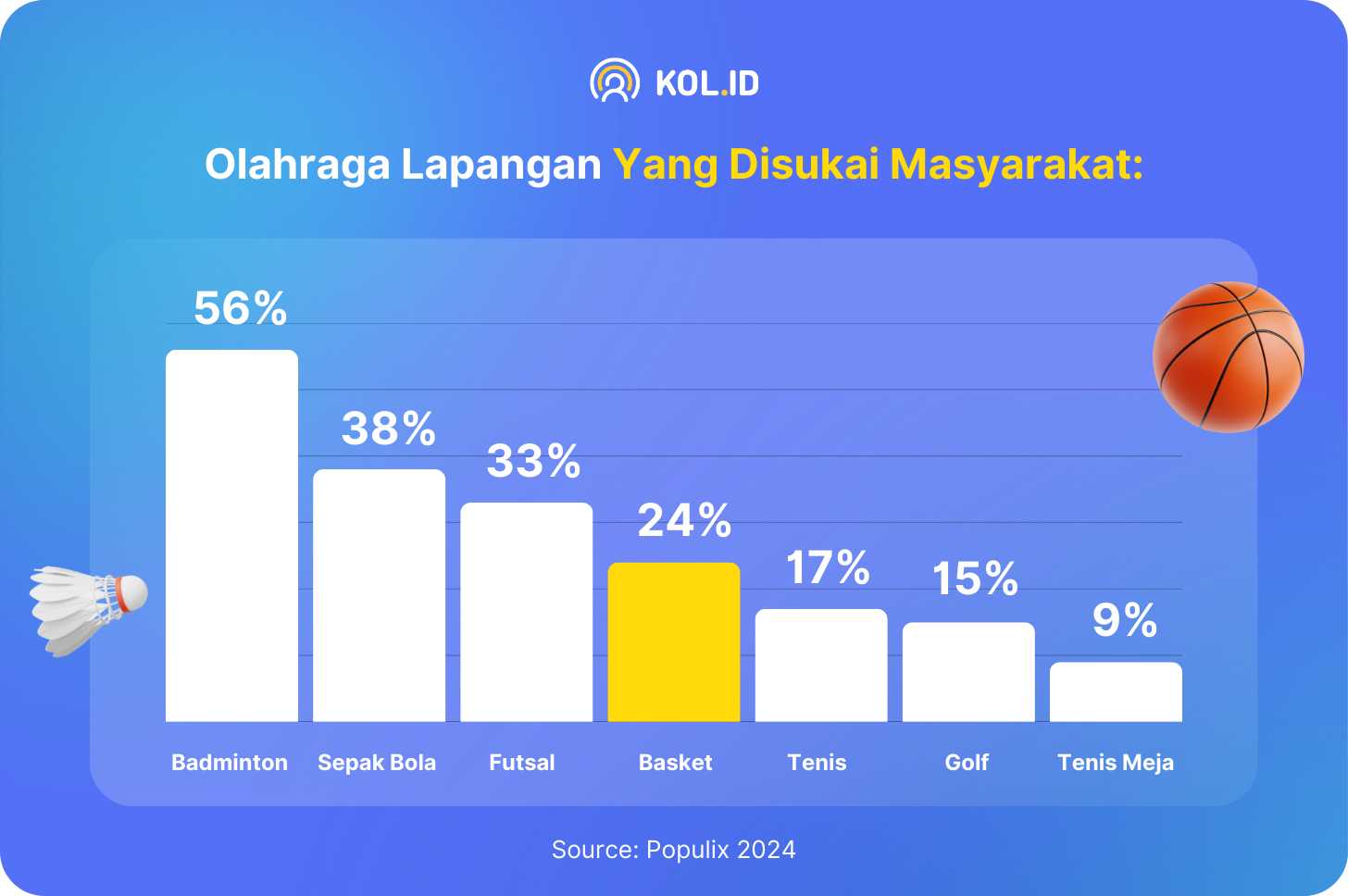Berdasarkan survei dari Populix 2024, basket menjadi olahraga lapangan posisi ke empat yang paling populer di kalangan masyarakat, dengan 24% responden menyatakan ketertarikan pada olahraga ini.