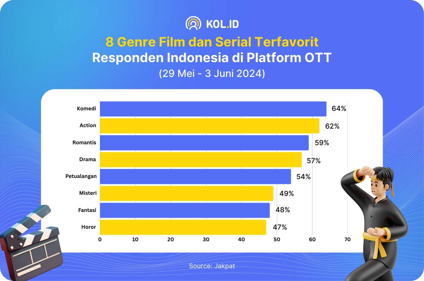 Survei terbaru dari Jakpat tahun 2024, genre action menduduki posisi ke-2 sebagai genre film dan serial terfavorit masyarakat Indonesia di platform streaming.