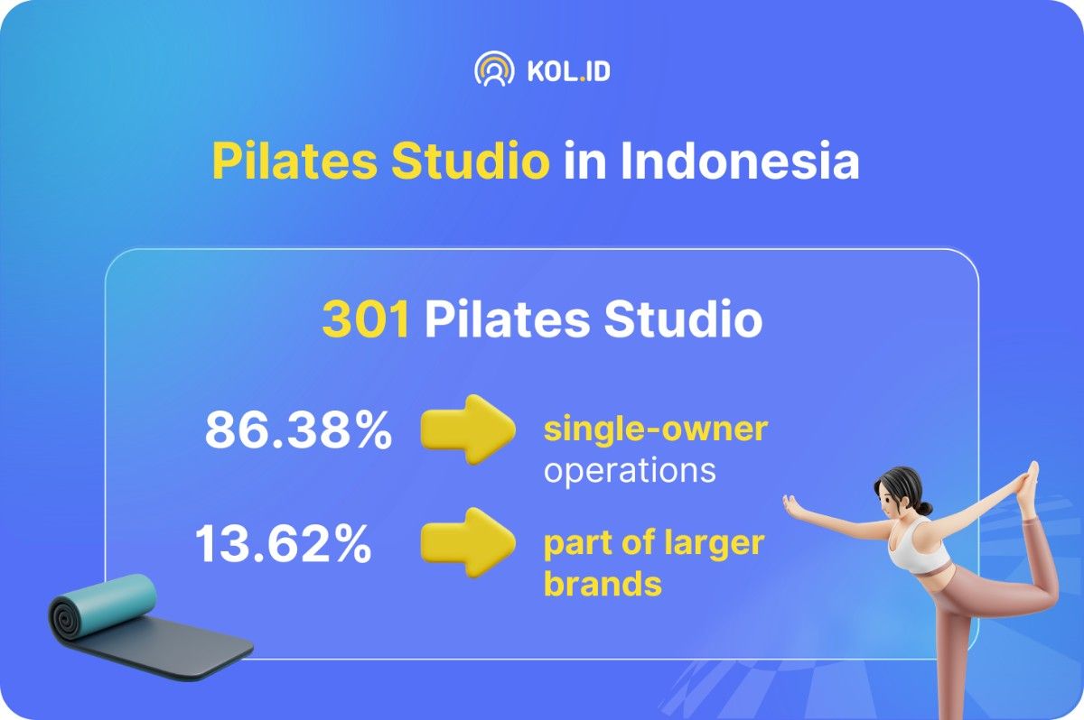 Menurut data dari rentechdigital.com yang diambil pada tanggal 5 Mei 2025, terdapat 301 pilates studio di Indonesia. 86,38% dimiliki oleh usaha milik perorangan atau independen, dan 13,62% merupakan bagian dari brand besar.