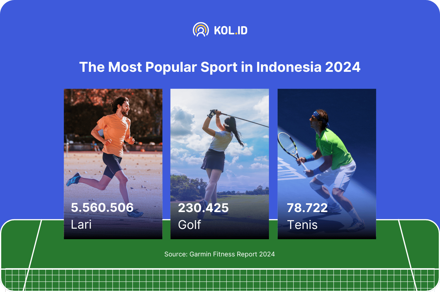 Data tersebut menjelaskan bahwa Lari, Golf, dan Tenis adalah olahraga yang paling populer di Indonesia pada tahun 2024. Tercatat ada sebanyak 5.560.506 aktivitas lari dan 230.425 aktivitas golf di Indonesia. Selain itu, olahraga tenis juga semakin banyak digemari masyarakat dengan catatan sebanyak 78.722 aktivitas sepanjang tahun 2024. Tingginya peminat olahraga tenis ini disebabkan oleh mudahnya aksesibilitas lapangan dan pengaruh para selebriti serta influencer dalam mempromosikan tren positif ini.