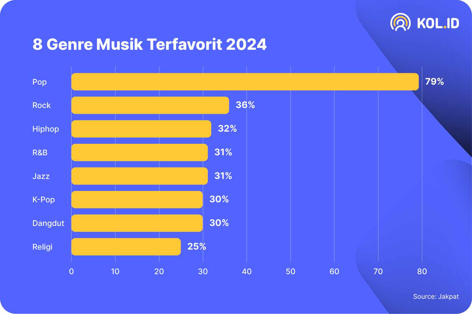 Data tersebut menunjukkan bahwa 79% masyarakat Indonesia menyukai genre pop, diikuti dengan genre rock (36%), hiphop (32%), R&B (31%), Jazz (31%), K-Pop (30%), dangdut (30%), religi (25%).