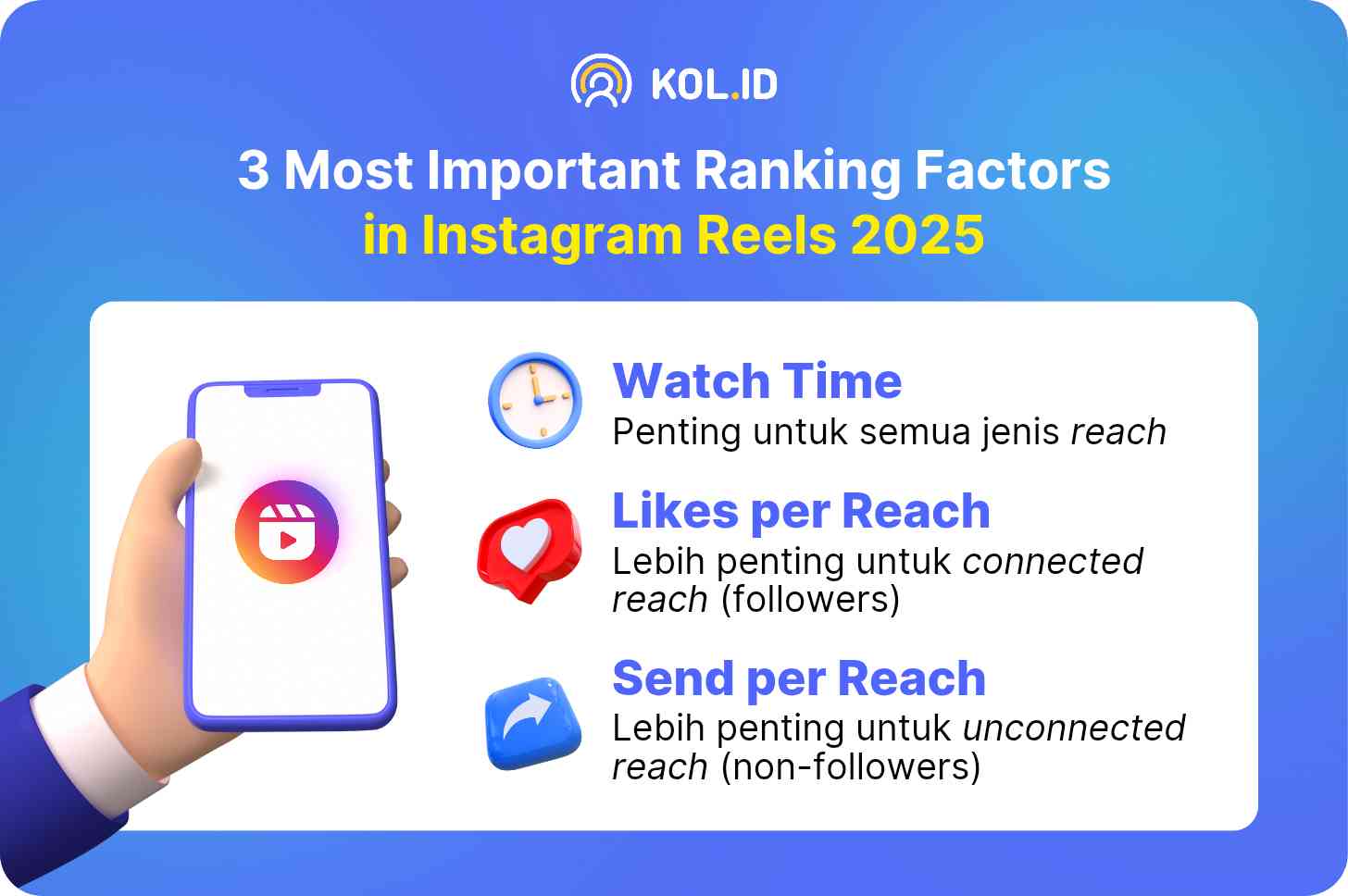 Influencer Marketing Hub (2021) menyarankan bahwa interaksi aktif dengan audiens serta penggunaan Reels adalah kunci utama untuk menjangkau audiens baru dan memperbesar peluang konten Anda tampil di Explore. Bagi Anda KOL atau influencer, memahami cara kerja algoritma Explore bisa dijadikan pedoman dalam merancang strategi pembuatan konten.