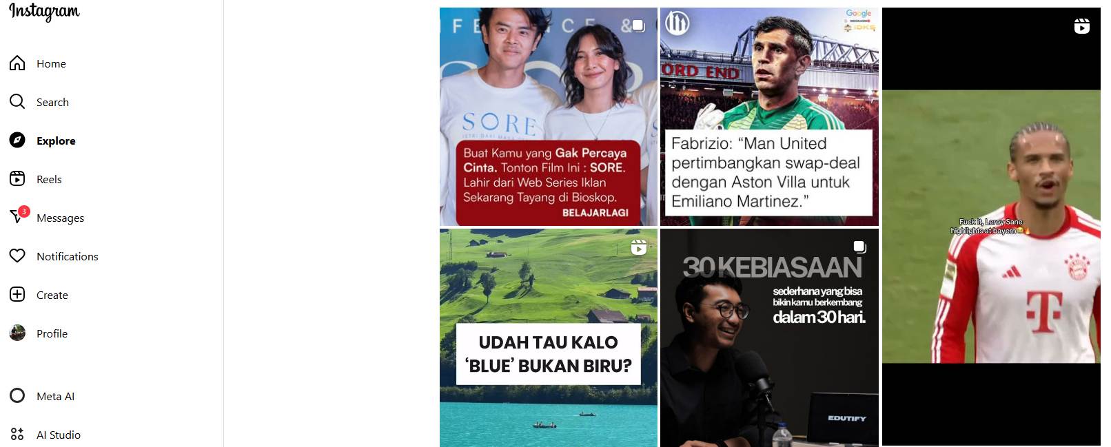 Gambar di atas merupakan contoh tampilan explore pada akun Instagram penulis, terlihat beberapa jenis konten seperti media yang membahas sebuah film terbaru, cuplikan highlight sepakbola, serta konten edukatif. Hal tersebut menandakan bahwa penulis sebagai pengguna Instagram sering melihat konten-konten serupa, di mana akhirnya Instagram merekomendasikan konten yang tidak jauh dari keseharian penulis. Pendekatan ini dirancang Instagram untuk meningkatkan pengalaman yang lebih personal bagi setiap pengguna.