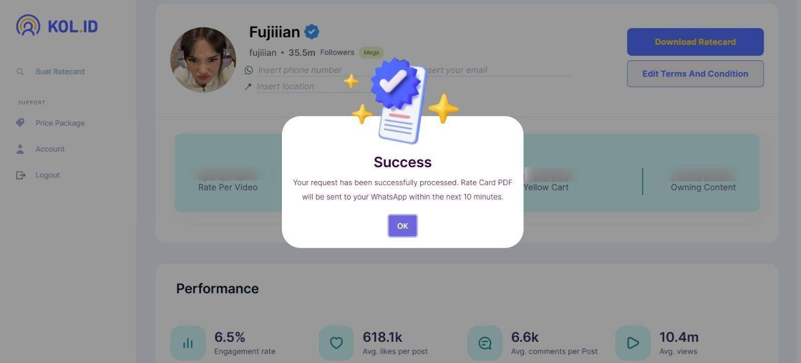 Agar lebih mudah menjalin kerja sama dengan brand atau klien, Anda bisa langsung mengunduh rate card dalam format PDF. Cukup klik ikon di pojok kanan atas, dan link download-nya akan langsung dikirimkan ke WhatsApp yang Anda daftarkan.