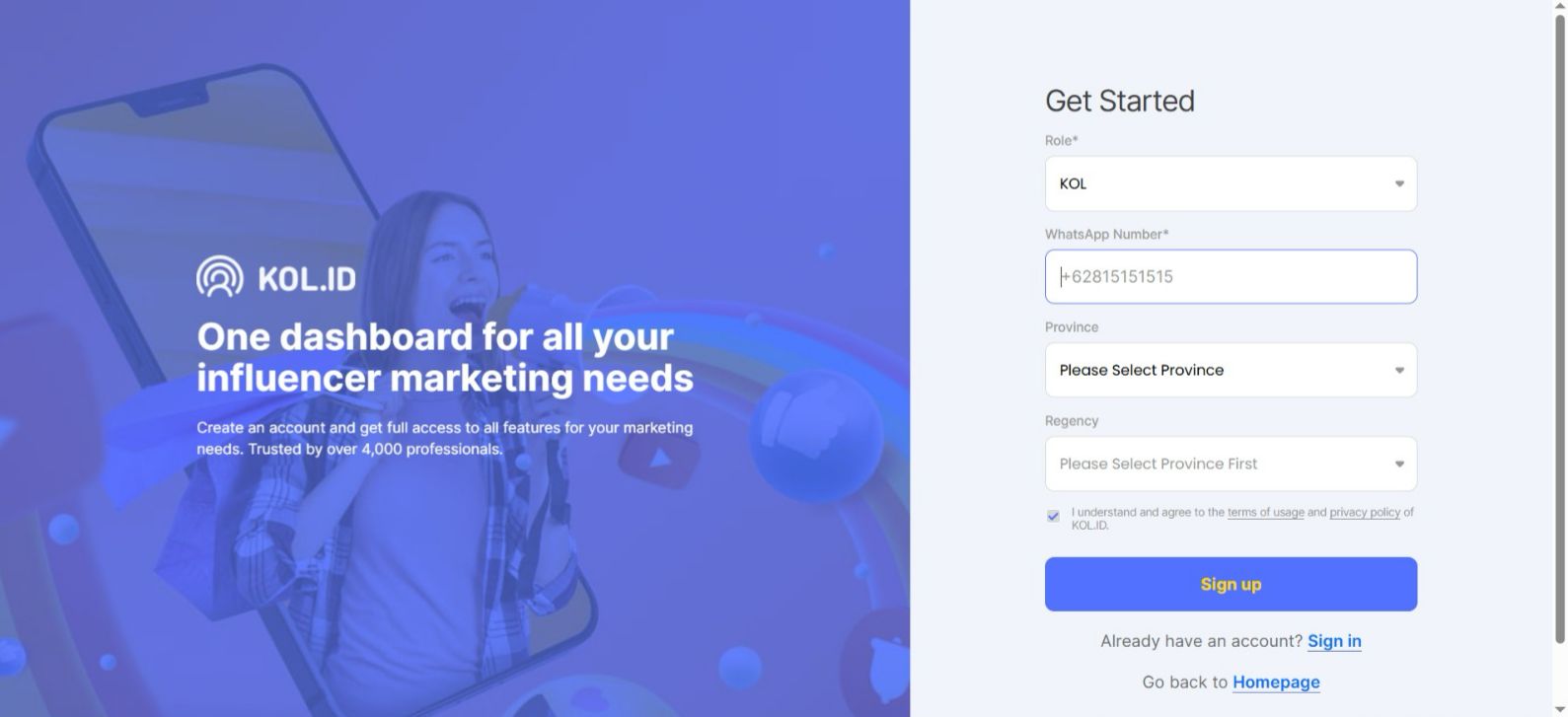 Untuk membuat rate card, Anda perlu membuat akun terlebih dahulu. Pilih “Sign Up” yang berada di kanan atas dan isi data yang diminta, mulai dari Role, nomor yang terdaftar di akun WhatsApp, provinsi dan kabupaten.