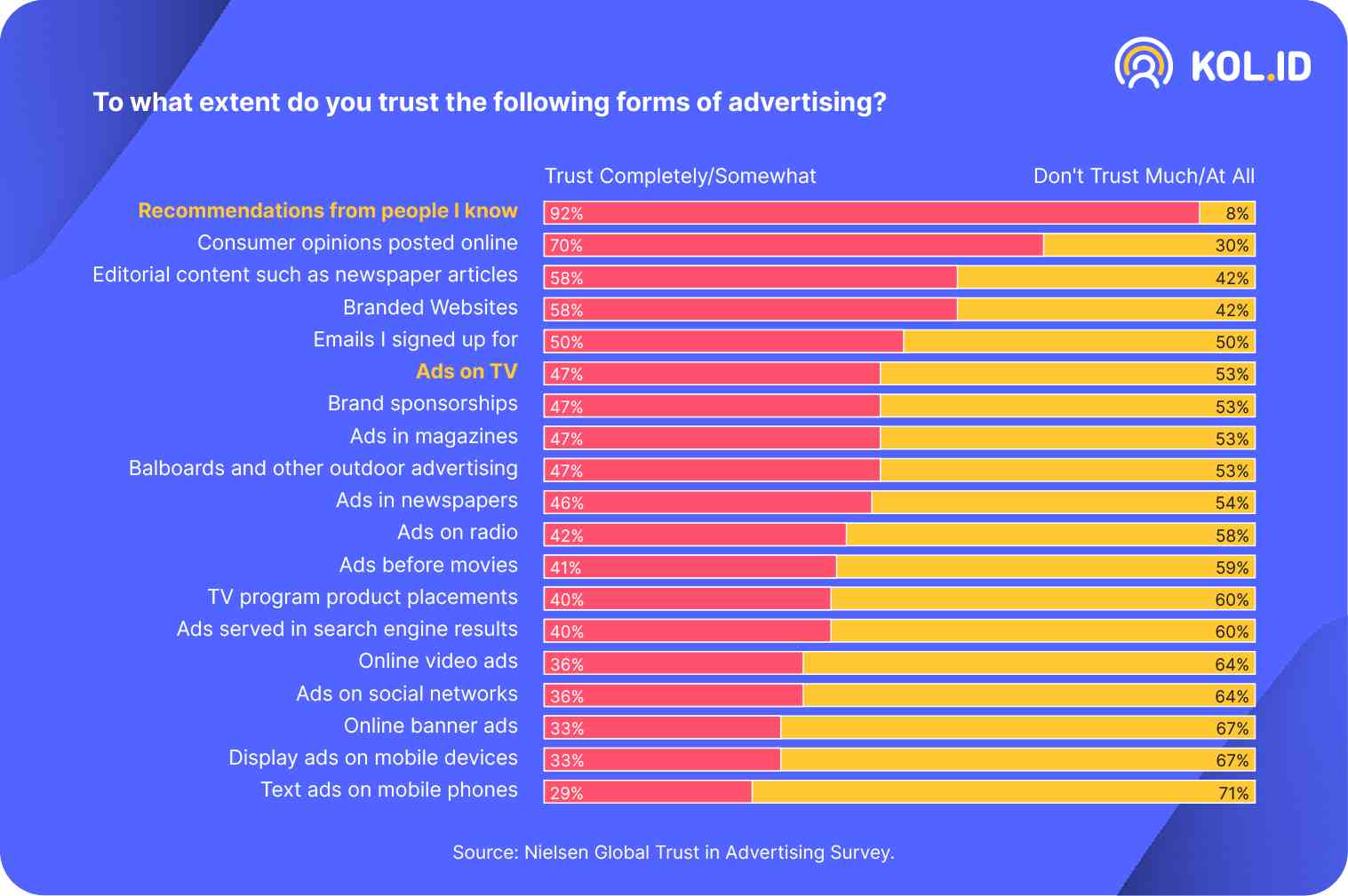 Survei tersebut mengungkapkan fakta bahwa 92% konsumen lebih tertarik membeli produk dari rekomendasi orang yang mereka kenal atau mulut ke mulut. Sedangkan, iklan yang dibuat brand di TV hanya mempengaruhi sekitar 47% konsumen.
