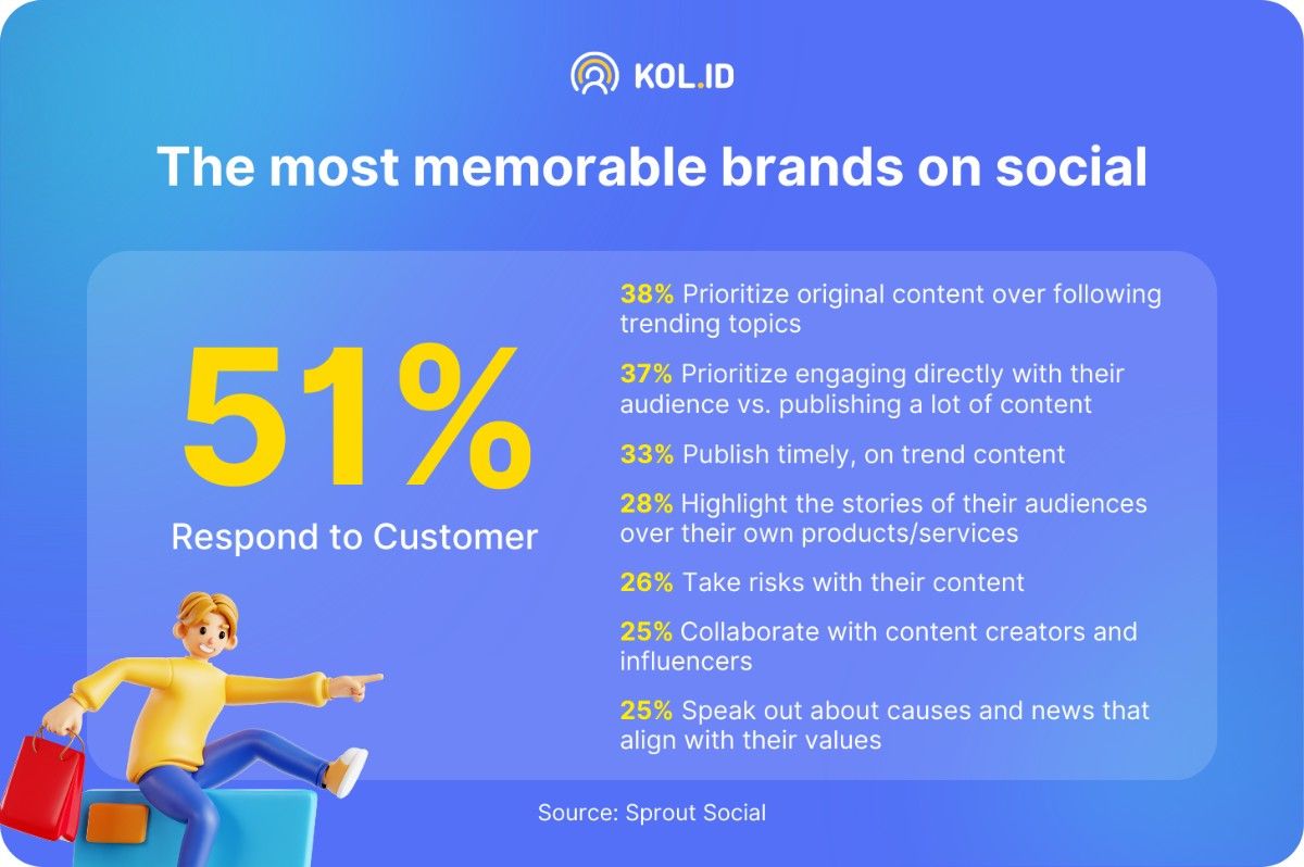 Konsumen sekarang justru lebih menghargai brand yang fokus memberikan pelayanan terbaik. Bahkan, data dari The 2023 Sprout Social Index mengungkapkan, sekitar 51% konsumen merasa hal itu lebih penting dibandingkan brand yang ikut berpendapat soal suatu isu, hanya sekitar 25% konsumen yang menganggap itu memorable.