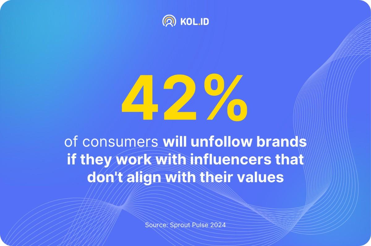 Jawabannya, ya tentu saja. Survei dari Sprout Pulse 2024 mengungkapkan bahwa 42% konsumen akan berhenti mengikuti brand jika mereka bekerja sama dengan influencer yang tidak sejalan dengan nilai-nilai konsumen.