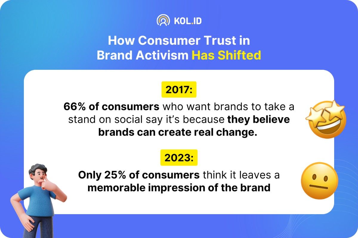 Namun, seiring berjalannya waktu, perilaku konsumen pun berubah. Beberapa tahun lalu, brand yang berani menyerukan pendapat tentang isu-isu yang terjadi dianggap penting dan bernilai di mata konsumen. Namun, sekarang hanya 25% konsumen yang merasa brand harus angkat suara mengenai isu sosial atau berita yang terjadi.