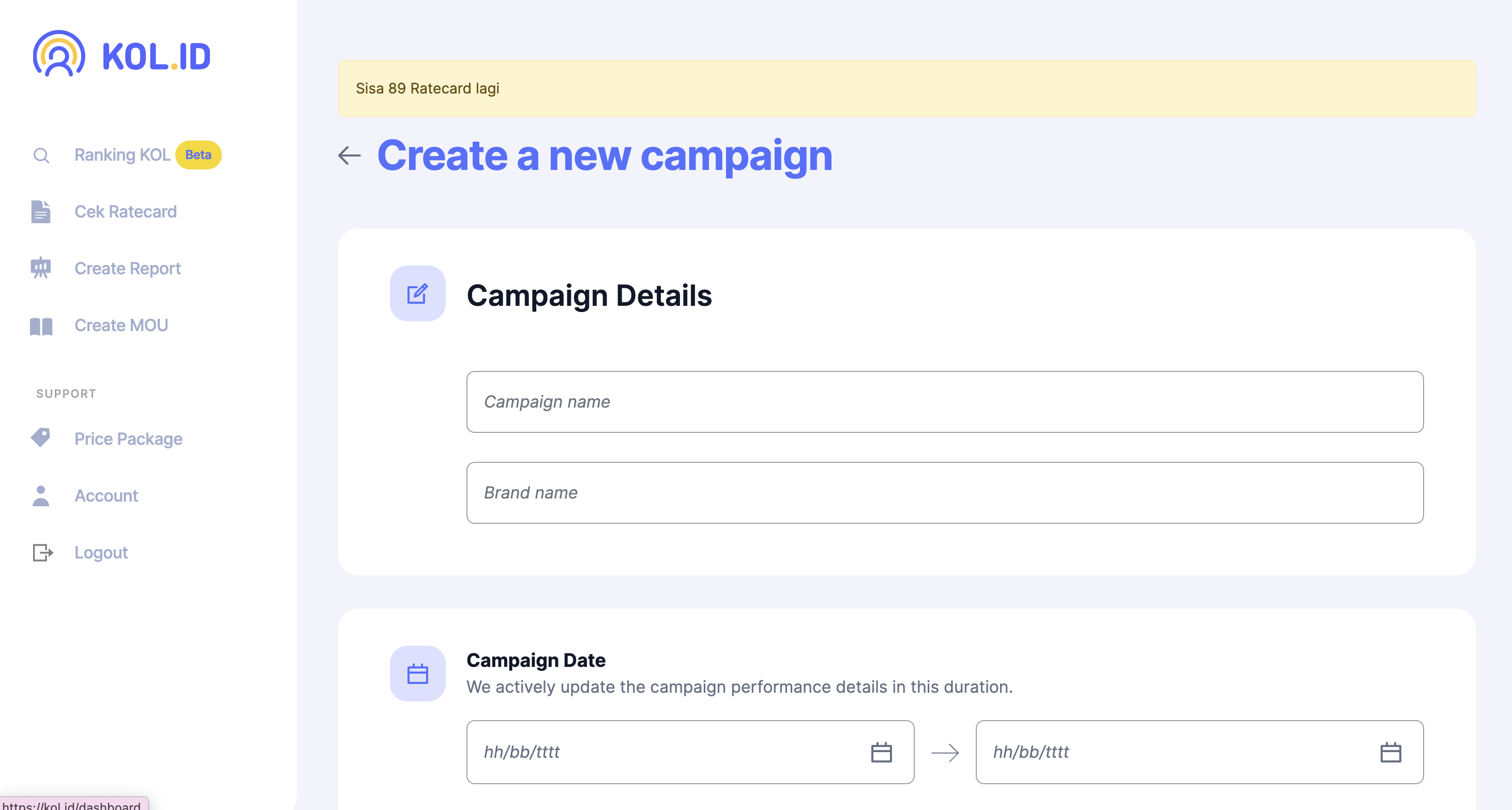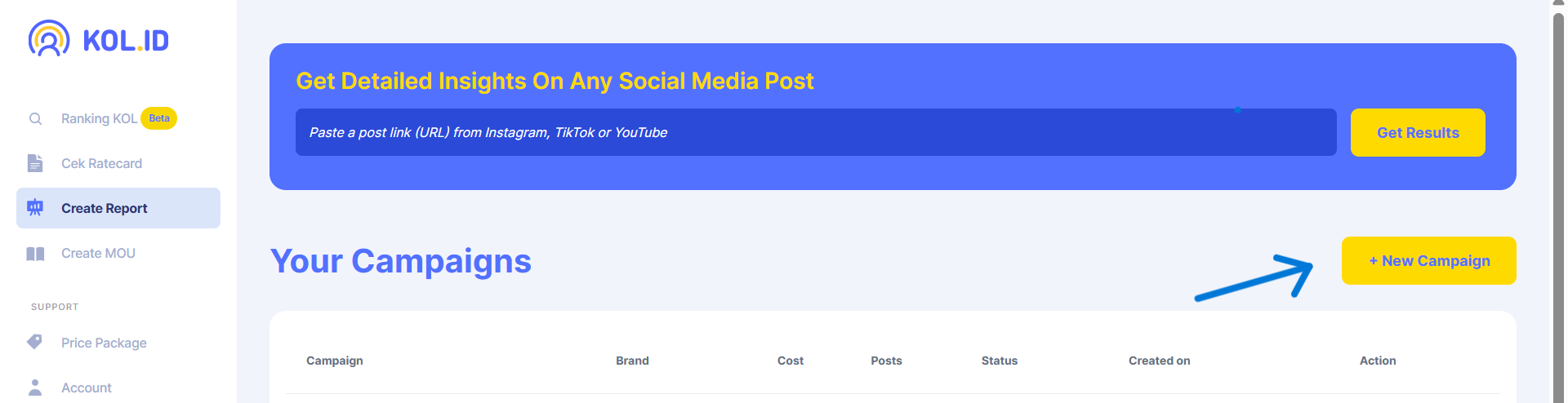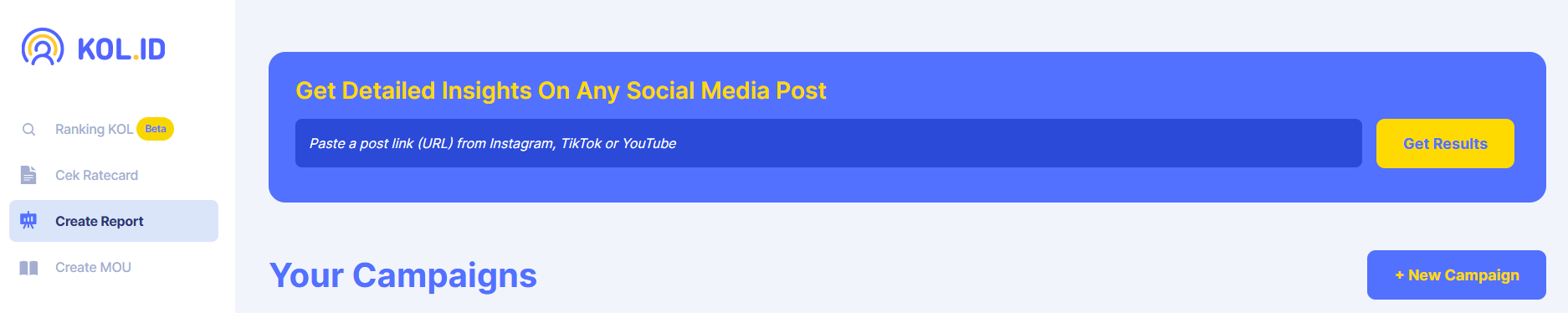 Untuk membuat report campaign yang melibatkan puluhan hingga ratusan KOL, klik “New Campaign”.