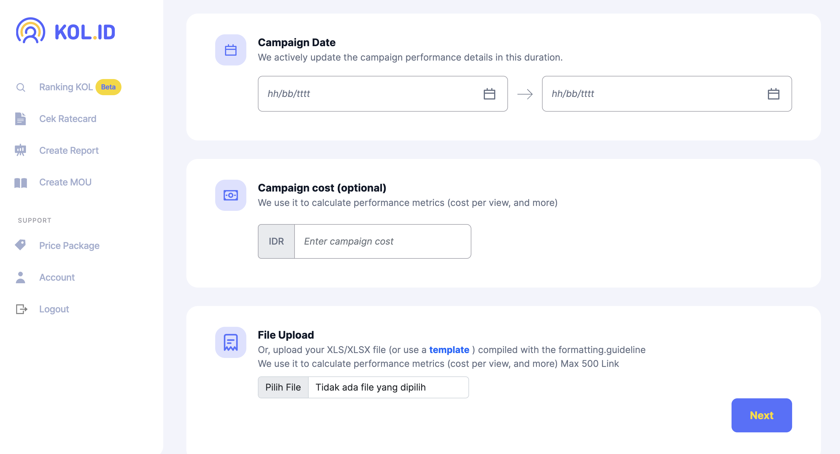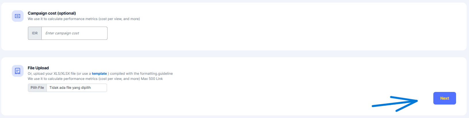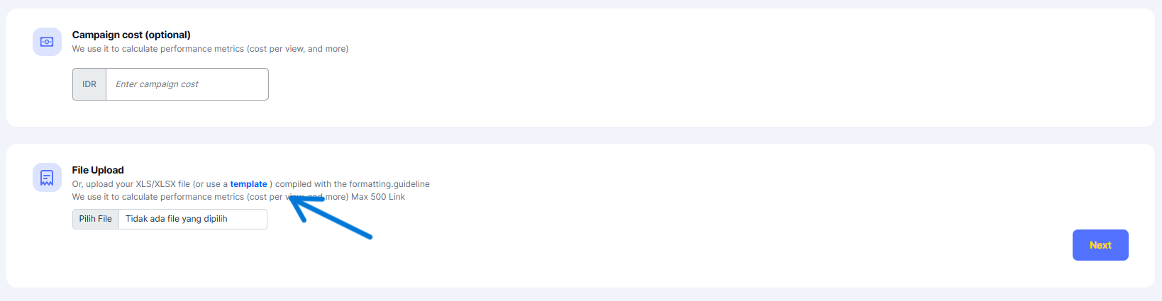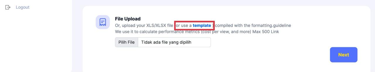 Isi template sederhana yang sudah disediakan. Isi template-nya pun mudah, Anda hanya isi dengan link postingan KOL yang berkolaborasi dalam campaign. Setelah diisi, unggah kembali ke tools.