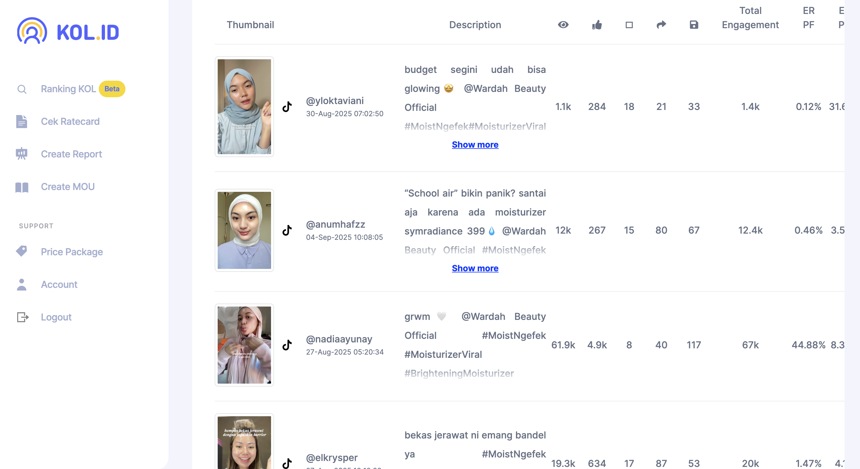 Nah, itulah cara membuat report campaign KOL. Mudah sekali, bukan? Anda tidak perlu mengumpulkan data secara manual dari berbagai KOL, atau bahkan harus membuka satu-satu platform media sosial. Dengan tools KOL.ID, semua campaign bisa diolah secara otomatis dan disajikan dalam report yang lengkap, mulai dari views, like, comment, hingga engagement rate.