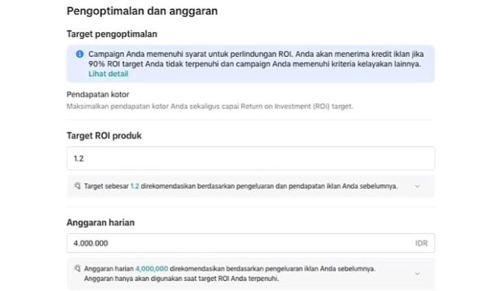 Anda perlu mencoba beberapa setting target ROI untuk menetapkan angka yang paling sesuai dengan produk dan target pasar Anda. Setelah iklan berjalan, lakukan evaluasi harian. Dari situ Anda bisa menaikkan atau menurunkan ROI dan anggaran sedikit demi sedikit sampai menemukan kombinasi angka yang paling ideal.