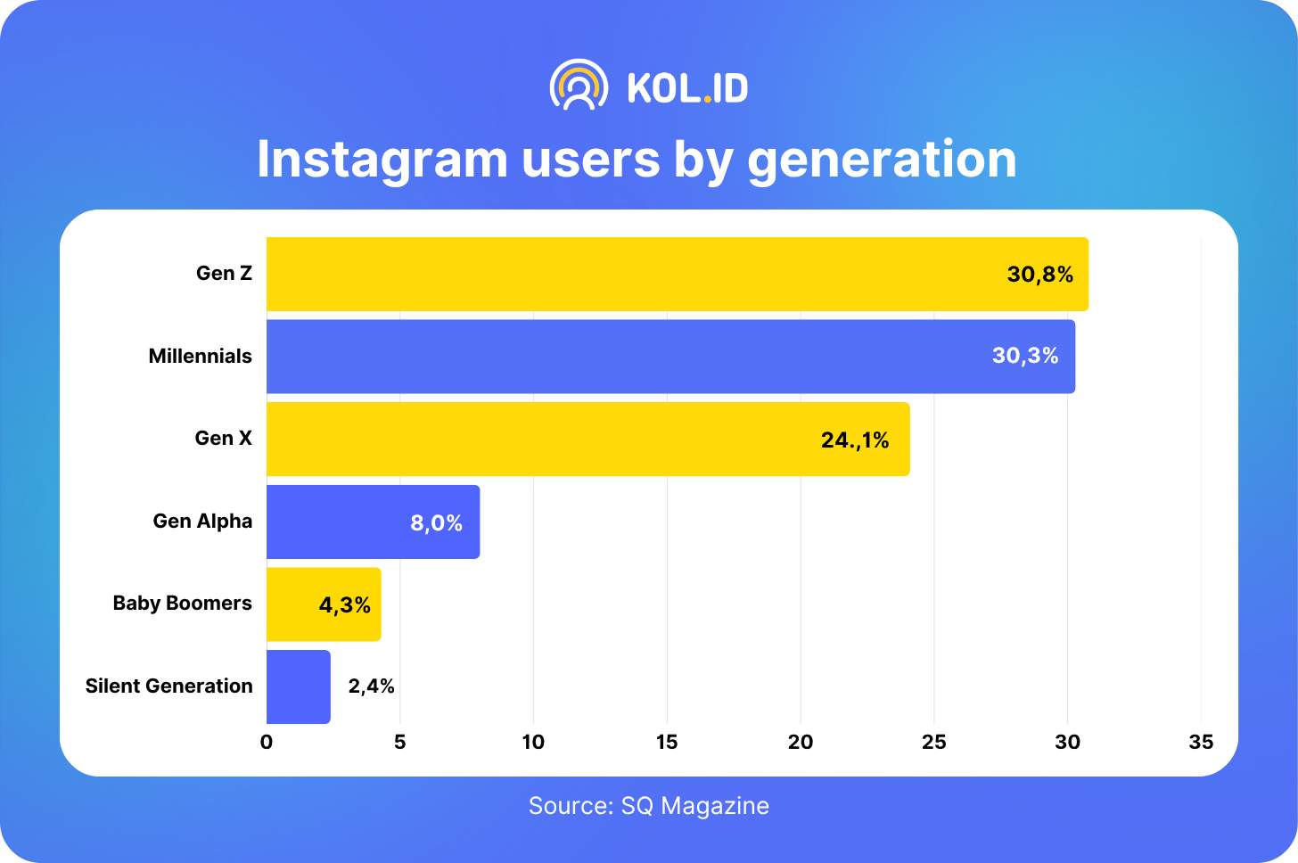 Setelah mengetahui banyaknya pengguna Instagram dari tahun ke tahun, lalu generasi mana yang paling dominan menggunakan Instagram? Berdasarkan dara SQ Magazine, Gen Z menjadi generasi terbesar di Instagram dengan proporsi sekitar 30,8% dari total pengguna global. Selanjutnya, Millenial yang berada di posisi kedua (30,3%), Gen Z (19,7%), Gen Alpha (8.0%), Baby Boomer (4.3%), Silent Generation (2,4%).