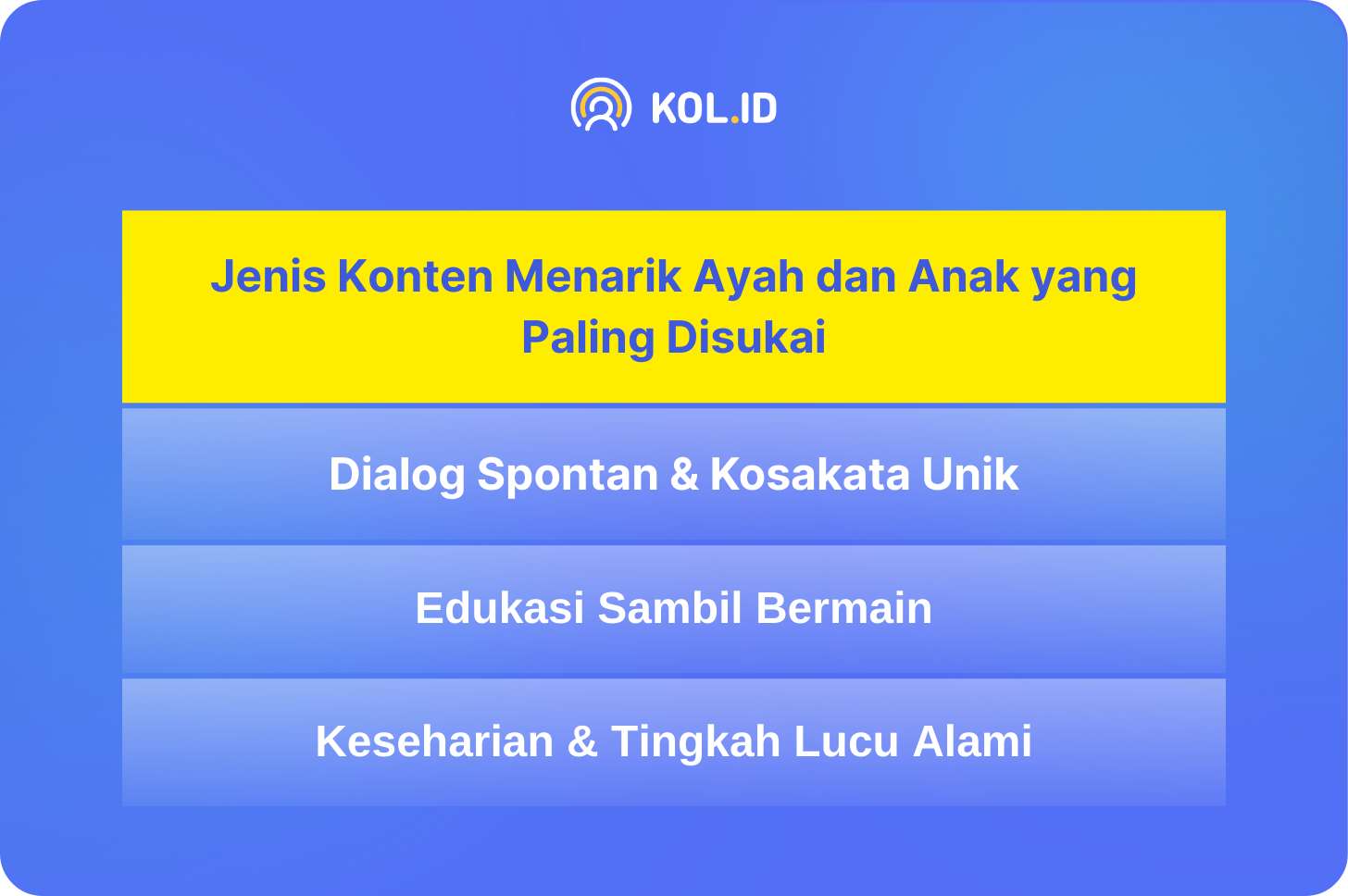 Berdasarkan rangkuman data dari tim KOL.ID, data di atas adalah tiga jenis konten menarik dari influencer ayah dan anak di Indonesia yang paling disukai oleh audiens. Hal ini menunjukkan bahwa konten yang cenderung spontan direkam, yang mengandung nilai edukasi, atau yang menampilkan keseharian cenderung menarik perhatian audiens di social media.
