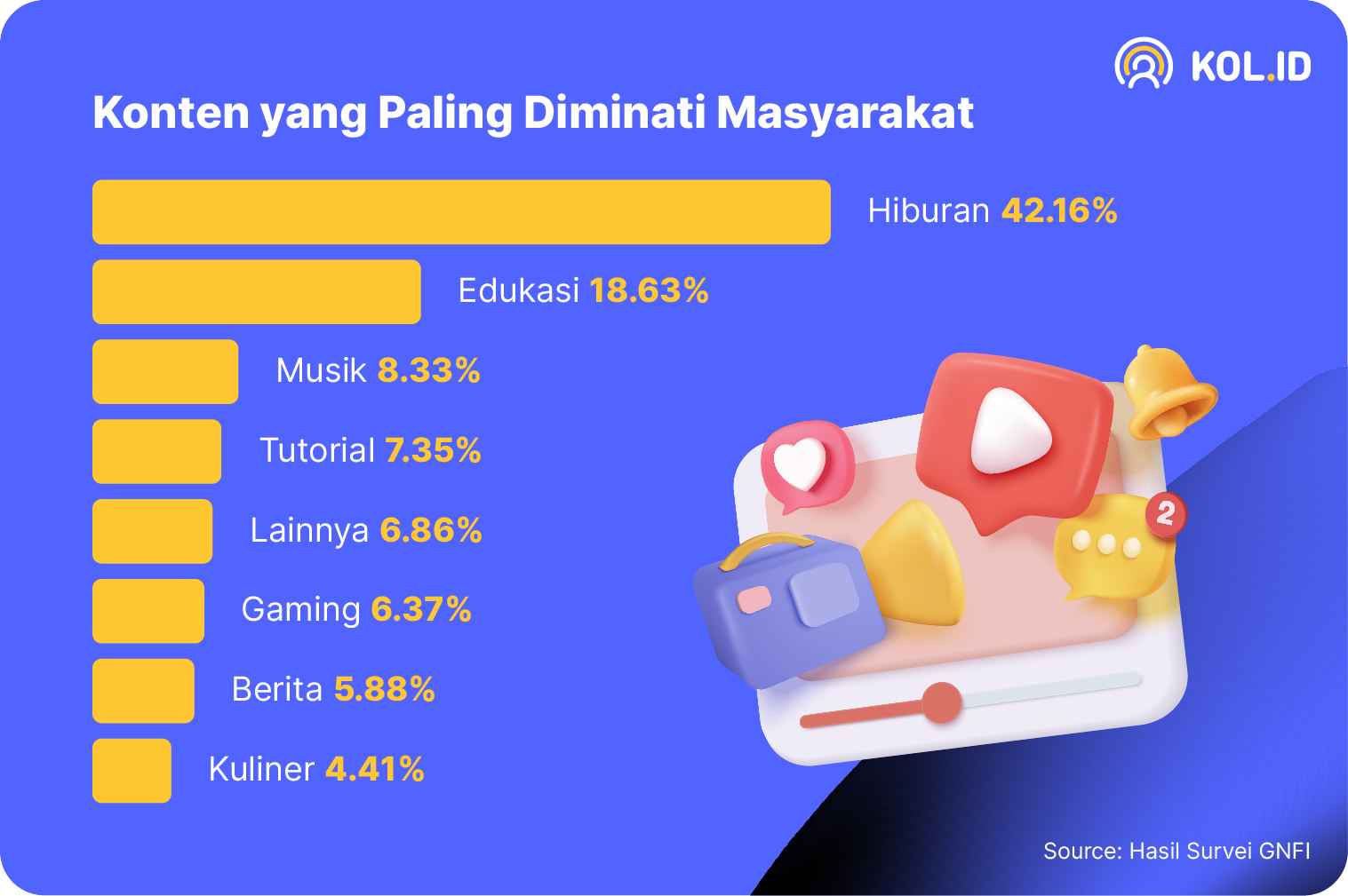Hasil survei tersebut menunjukkan bahwa 42,16% masyarakat Indonesia lebih menyukai konten hiburan, jauh mengungguli konten edukasi yang hanya meraih sekitar 18,63%. Sisanya tersebar pada konten musik (8,33%), tutorial (7,35%), dan lainnya.