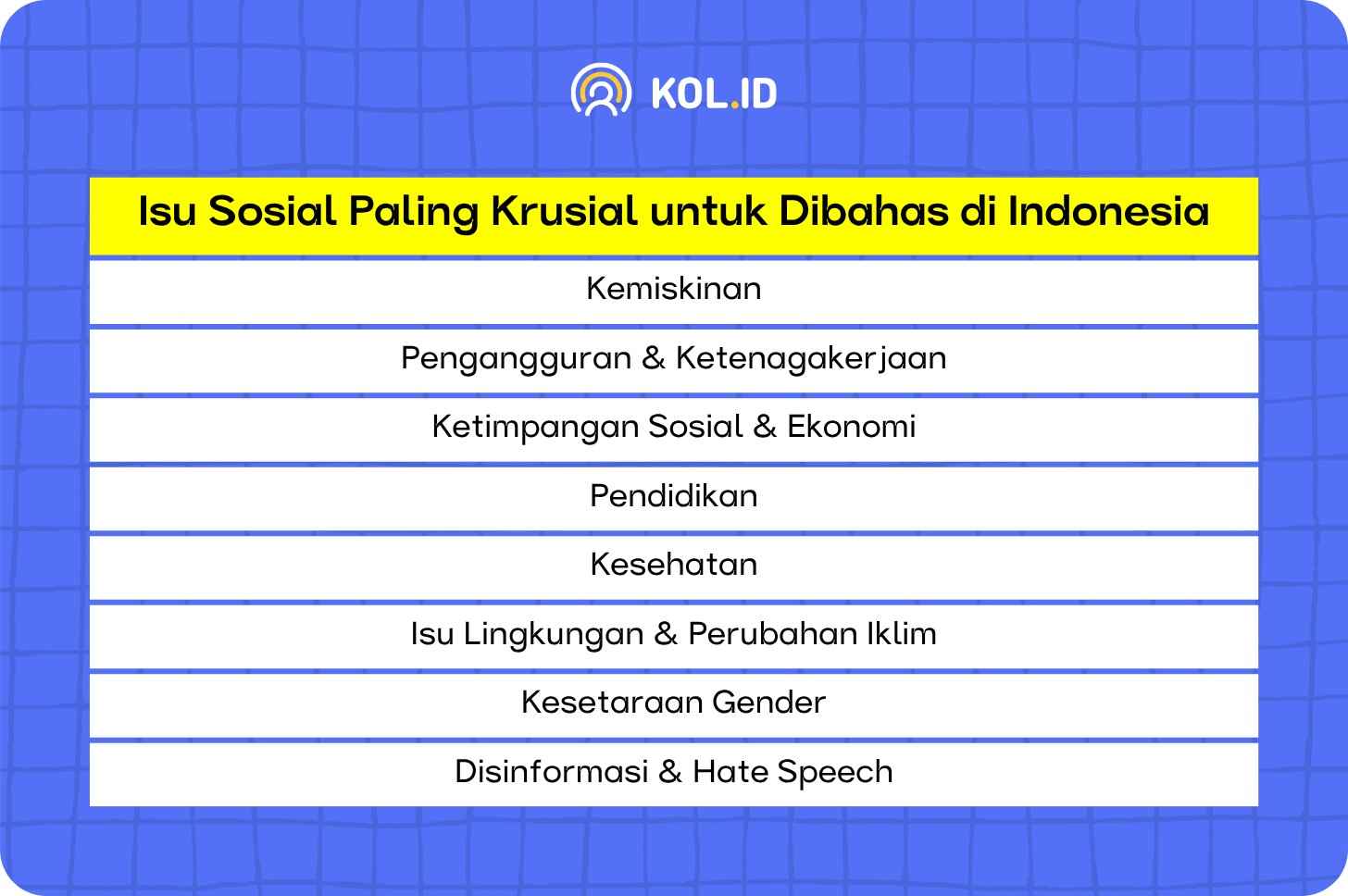 Dalam era digital saat ini, peran Key Opinion Leader atau KOL tidak hanya terbatas pada promosi produk, tetapi juga dapat dimanfaatkan untuk membawa perubahan sosial. Banyak public figure yang memanfaatkan pengaruhnya di social media untuk mengangkat isu kemanusiaan, lingkungan, pendidikan, hingga kebijakan publik. Berdasarkan data dari Badan Pusat Statistik, berikut ini adalah isu sosial paling krusial dan sering dibahas di Indonesia.