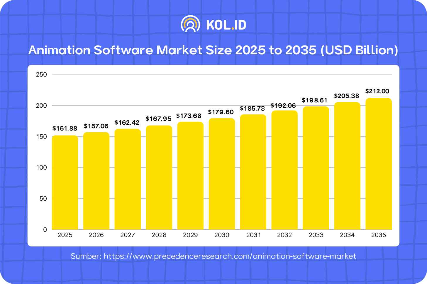 Berdasarkan data dari Precedence Research per Januari 2026, nilai pasar software animasi diproyeksikan akan tumbuh stabil dan konsisten sepanjang periode 2025–2035. Nilai pasar ini diprediksi meningkat setiap tahun, dimulai dari sekitar $151,88 juta USD pada 2025 dan terus berkembang hingga sekitar $212,00 juta USD pada 2035. Tren ini menunjukkan bahwa animasi menjadi sektor kreatif yang memiliki prospek pertumbuhan jangka panjang dan kontribusi signifikan terhadap ekonomi digital secara global.