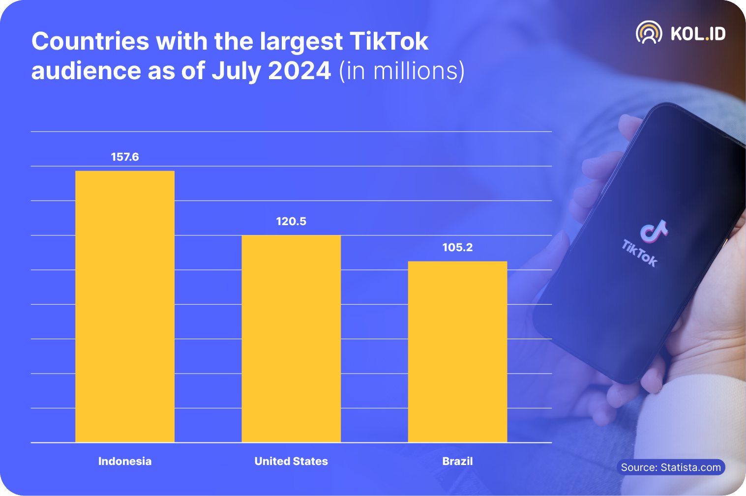 Amerika Serikat menyusul, menjadi negara kedua pengguna TikTok terbanyak sekitar 120.5 juta. Selain itu, Brazil di urutan ketiga dengan pengguna mencapai 105.3 juta di platform TikTok.