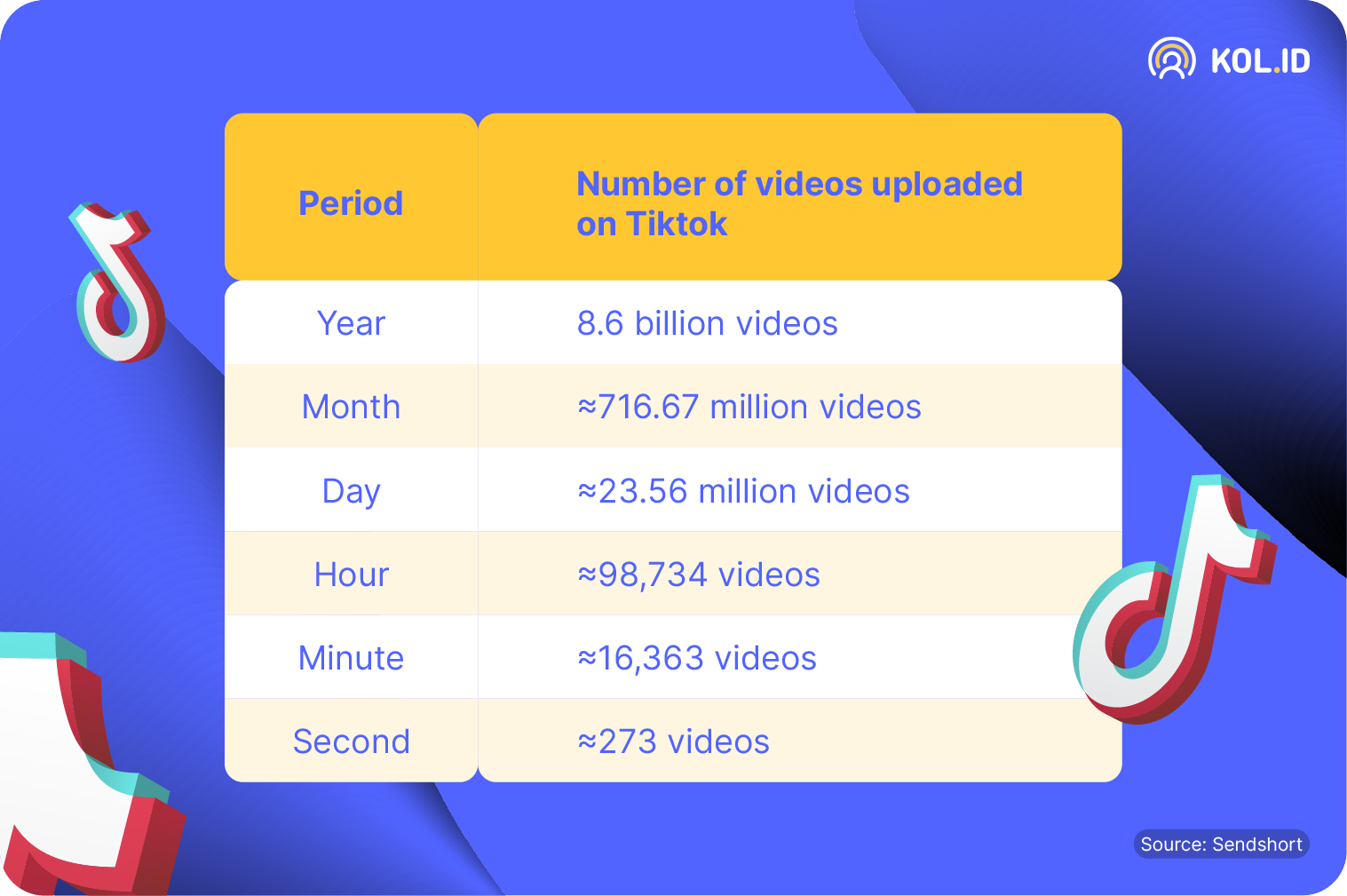 Hasil riset Sendshort menjelaskan pada tahun 2021 terdapat sekitar 716.67 juta video yang diunggah ke TikTok per bulan, 23.65 juga video per hari, 981.735 video per jam, 16.363 video per menit dan 273 video per detik. Artinya, dalam setiap detik, terdapat ratusan video baru yang diunggah di TikTok di mana ini menunjukkan betapa aktifnya pengguna TikTok global dalam membuat konten di platform ini.