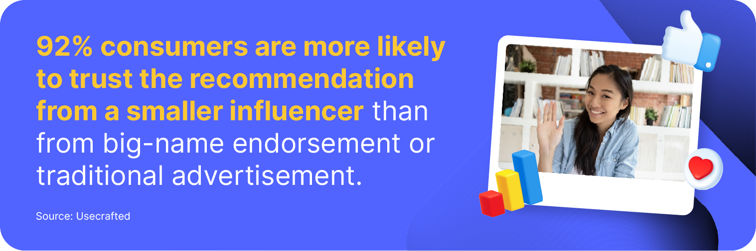 Data dari usecrafted mengungkapkan bahwa 92% konsumen cenderung lebih mempercayai rekomendasi dari influencer yang lebih kecil daripada selebriti atau iklan.