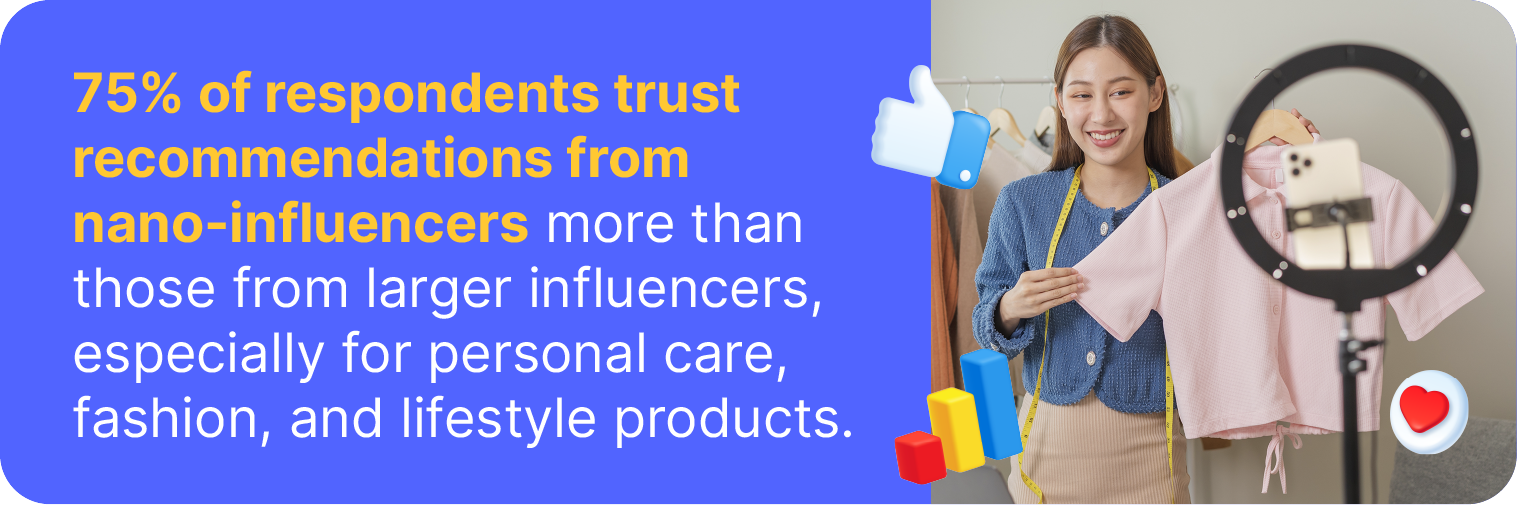 Ini menunjukkan bahwa audiens memiliki kepercayaan tinggi terhadap produk atau jasa yang dipromosikan oleh nano dan micro-influencer dibandingkan dengan influencer yang lebih besar atau bahkan iklan langsung dari brand.