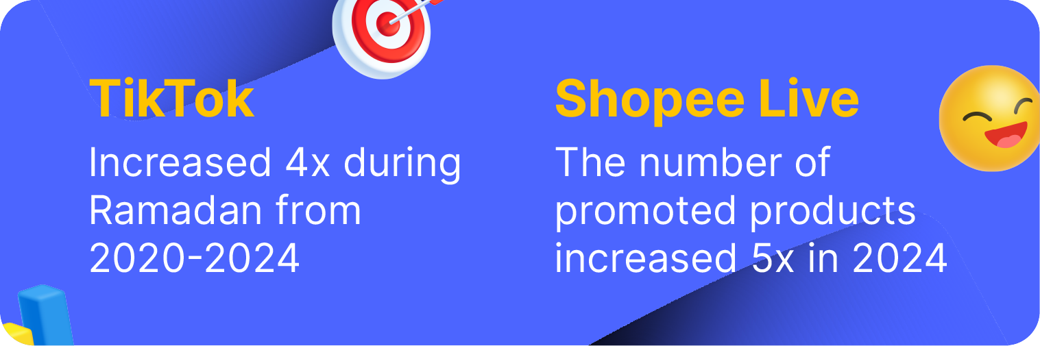Hal ini dibuktikan berdasarkan data dari SIRCLO yang mengungkapkan bahwa selama ramadhan, transaksi di TikTok meningkat 4 kali lipat selama periode 2020-2024. Selain itu, tren live shopping juga semakin populer di Shopee, di mana jumlah produk yang dipromosikan melalui shopee live naik 5 kali lipat pada tahun 2024 dibandingkan tahun sebelumnya.