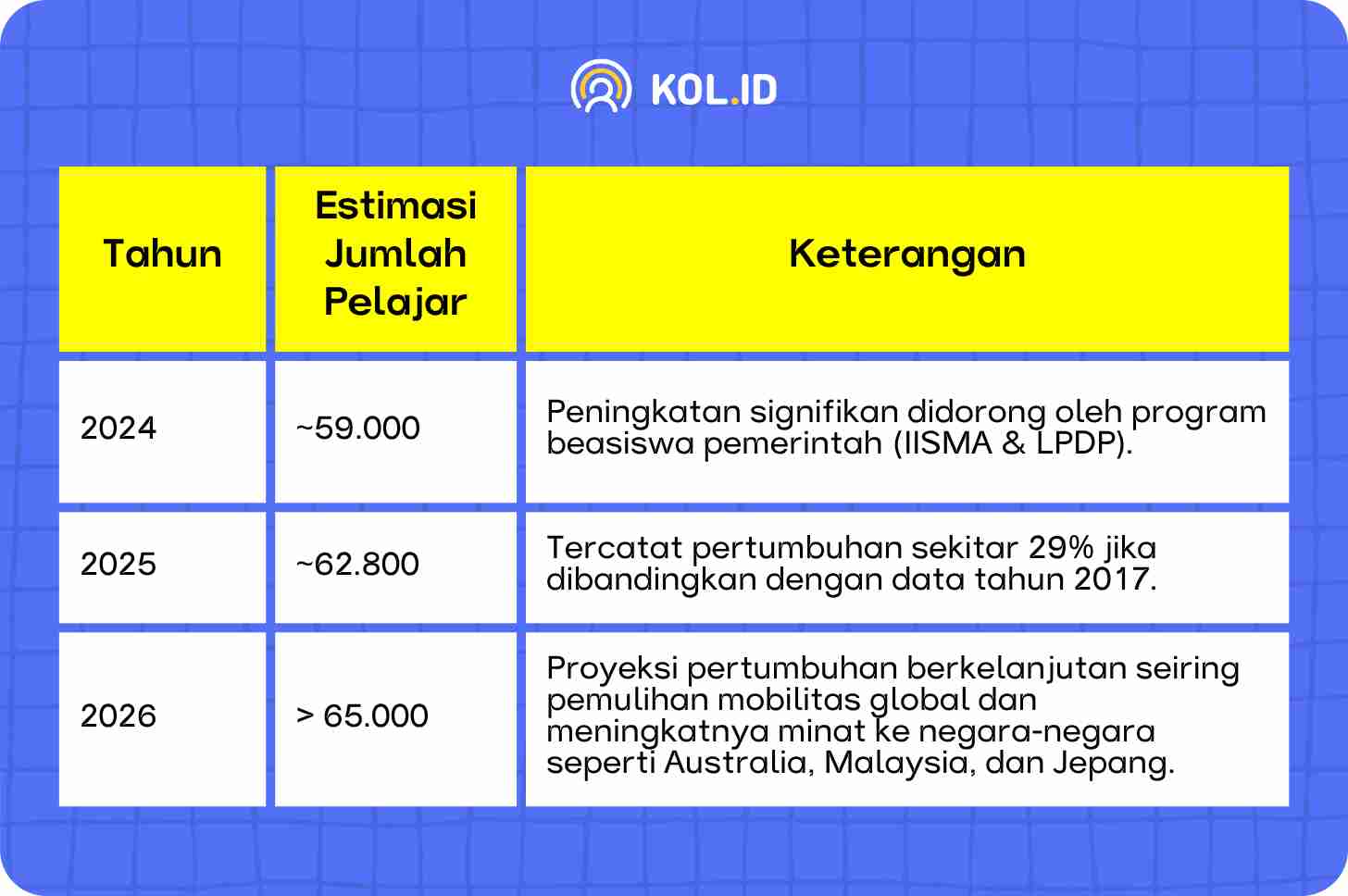 Berdasarkan laporan dari UNESCO Institute for Statistics dan ICEF Monitor 2026, jumlah mahasiswa Indonesia yang menempuh pendidikan di luar negeri menunjukkan peningkatan yang stabil. Peningkatan ini dapat disebabkan oleh kehadiran para KOL pelajar Indonesia di luar negeri yang menjadi inspirasi sekaligus sumber informasi bagi audiens untuk merencanakan studi ke luar negeri.