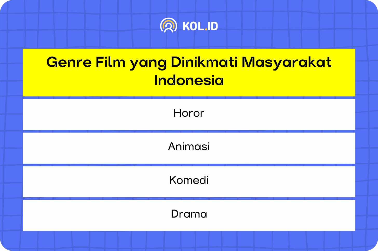 Menurut data Direktorat Jenderal Pengembangan, Pemanfaatan, dan Pembinaan Kebudayaan di Januari 2026, jumlah penonton film Indonesia sepanjang 2025 mencapai 80,27 juta orang. Berikut ini beberapa genre film yang memiliki komposisi pasar terbesar di Indonesia.