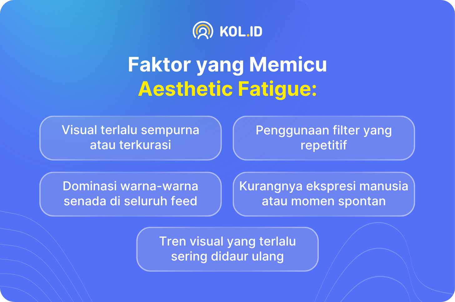 Aesthetic fatigue adalah kondisi ketika audiens merasa bosan atau tidak lagi tertarik pada konten visual yang terlalu dibuat-buat atau mengikuti tren estetika yang sudah usang. Studi dari Sprout Social (2023) menunjukkan bahwa 34% pengguna media sosial mengaku lebih tertarik pada konten yang tampak natural dan autentik ketimbang visual yang terlalu sempurna. Hal ini menunjukkan adanya pergeseran preferensi terhadap gaya komunikasi visual yang lebih original dan jujur.