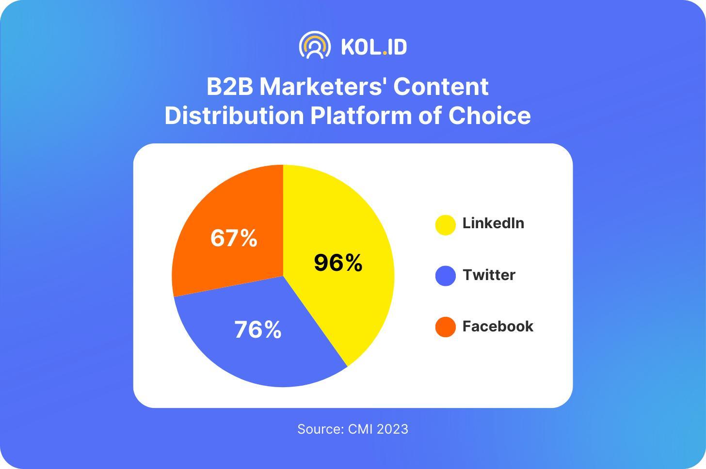 Studi lainnya dari Content Marketing Institute (CMI) 2023 juga menyebutkan bahwa 96% marketer B2B menggunakan LinkedIn sebagai platform distribusi konten utama, mengungguli semua platform lain, termasuk Twitter dan Facebook.