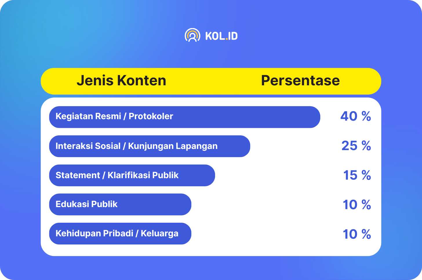 Menariknya, terdapat pola tertentu dalam jenis konten yang diunggah oleh para menteri di akun resminya. Berdasarkan observasi yang disusun tim KOL.ID berdasarkan tren konten yang sering ditemukan pada akun Instagram menteri-menteri Indonesia dalam beberapa waktu kebelakang, berikut ini adalah persentase jenis unggahan yang paling sering ditemukan di Instagram menteri Indonesia.