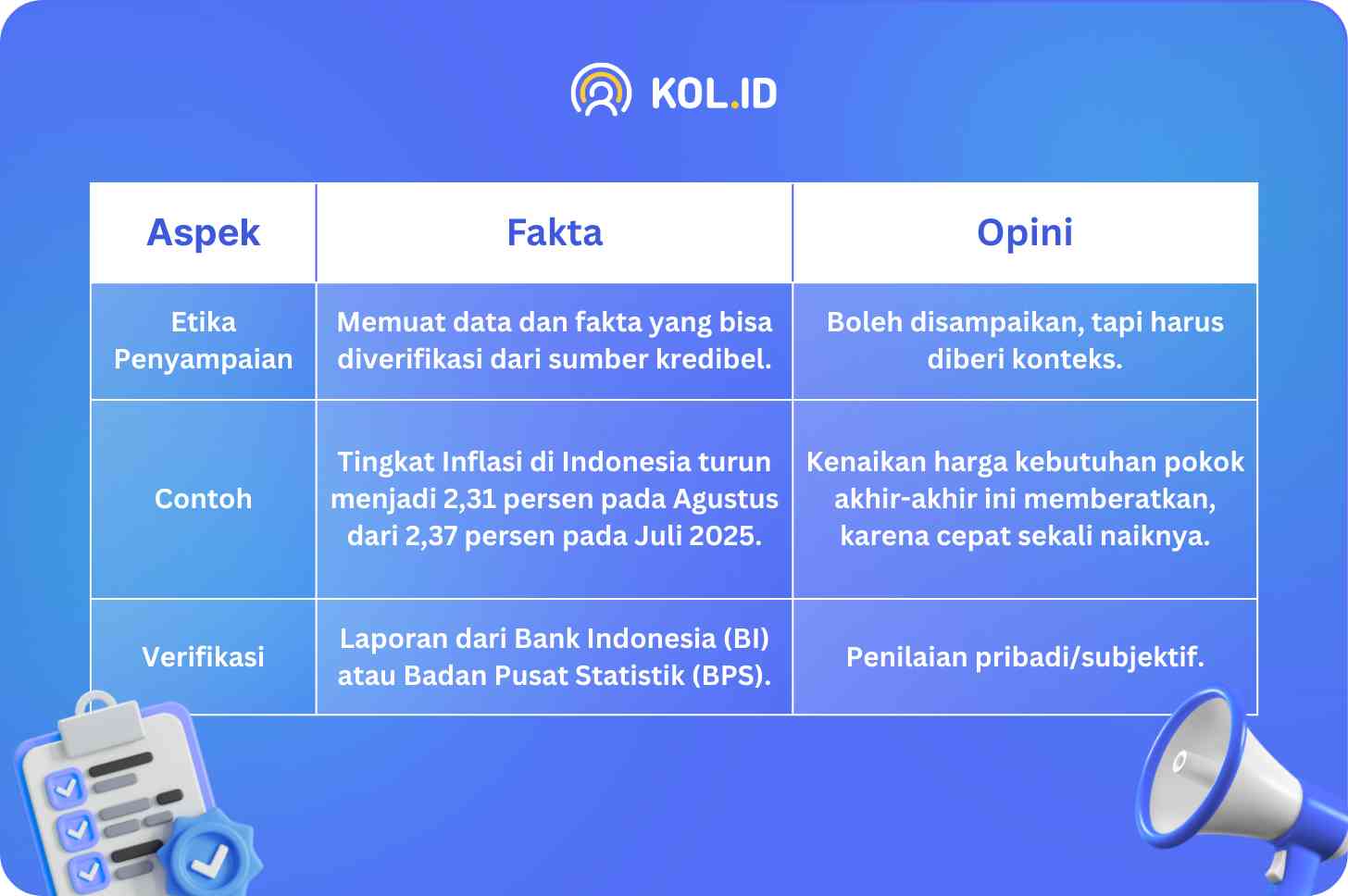 Etika merupakan pondasi utama dalam setiap proses komunikasi. Ketika KOL memproduksi konten, penting untuk membedakan antara fakta dan opini. Fakta adalah kebenaran yang dapat diverifikasi melalui data, sementara opini adalah pandangan subjektif yang boleh disampaikan, tetapi harus jelas konteksnya.
