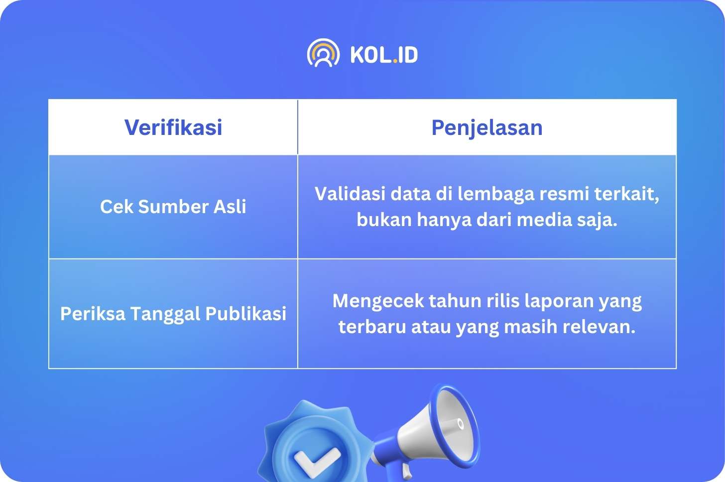 Informasi lama yang tidak relevan seringkali kembali beredar. Periksa tahun dan tanggal publikasi laporan, artikel, atau data. Pastikan Anda menggunakan data terbaru agar penerima informasi tidak keliru dalam menafsirkan konteks.