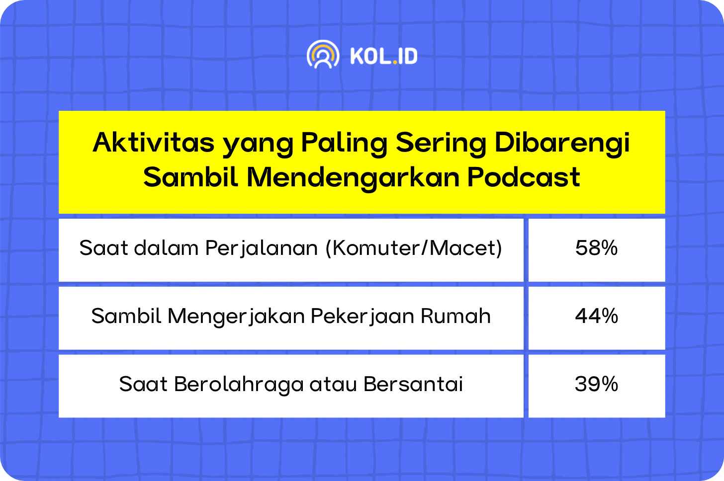 Alasan lain yang membuat podcast diminati adalah efisiensinya dalam penggunaan waktu. Anda dapat mendengarkan podcast sambil melakukan aktivitas lain seperti bekerja, berolahraga, atau berkendara. Berdasarkan laporan Populix, berikut ini adalah tiga aktivitas utama yang paling sering dibarengi dengan mendengarkan podcast.