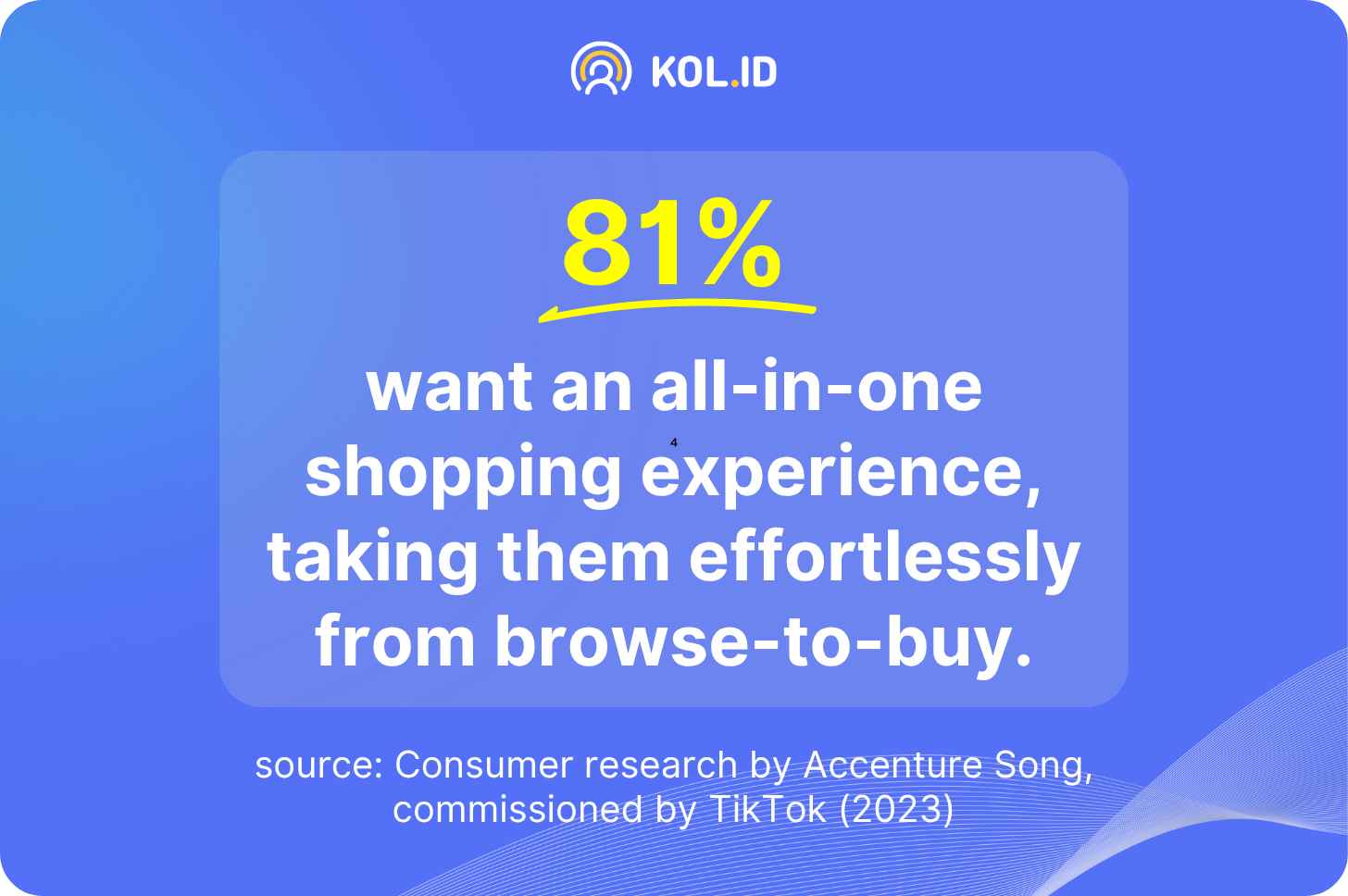 Sebanyak 81% pengguna TikTok menyatakan mereka menginginkan pengalaman belanja “all-in-one”, dari penemuan produk hingga pembelian dalam satu aplikasi. Ini menunjukkan bahwa pola konsumen sekarang mau yang simple dalam berbelanja online, mereka mencari dan membeli barang dalam 1 platform yang sama.