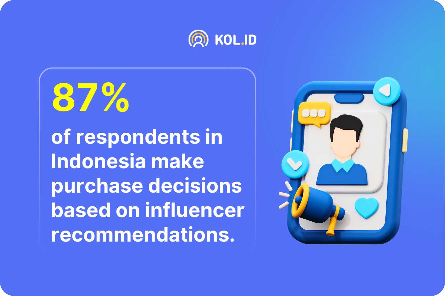 Survei dari Cube Asia, mengungkapkan bahwa 87% responden di Indonesia memutuskan pembelian produk berdasarkan rekomendasi influencer.