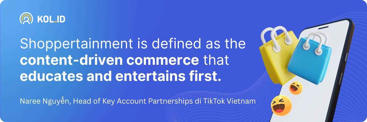 TikTok telah membentuk pendekatan baru dalam dunia social commerce yang disebut Shoppertainment, yaitu penggabungan antara hiburan dan pengalaman belanja. Konsep ini menggabungkan konten hiburan yang menyenangkan sebelum akhirnya konsumen tertarik membeli produk.