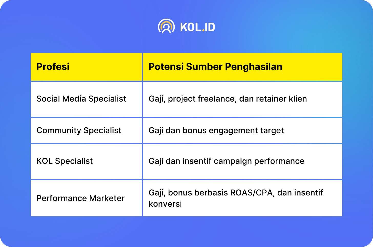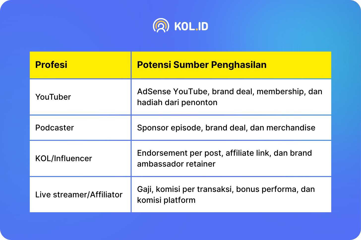 Profesi lain yang sangat dikenal adalah KOL atau influencer. Key Opinion Leader (KOL) merupakan individu yang memiliki audiens cukup besar di social media dan mampu memengaruhi opini atau keputusan pengikutnya. Influencer biasanya bekerja sama dengan brand untuk mempromosikan produk atau layanan melalui berbagai format konten. Sumber penghasilan profesi ini umumnya berasal dari endorsement per postingan, program affiliate marketing, serta kontrak kerja sama jangka panjang sebagai brand ambassador.