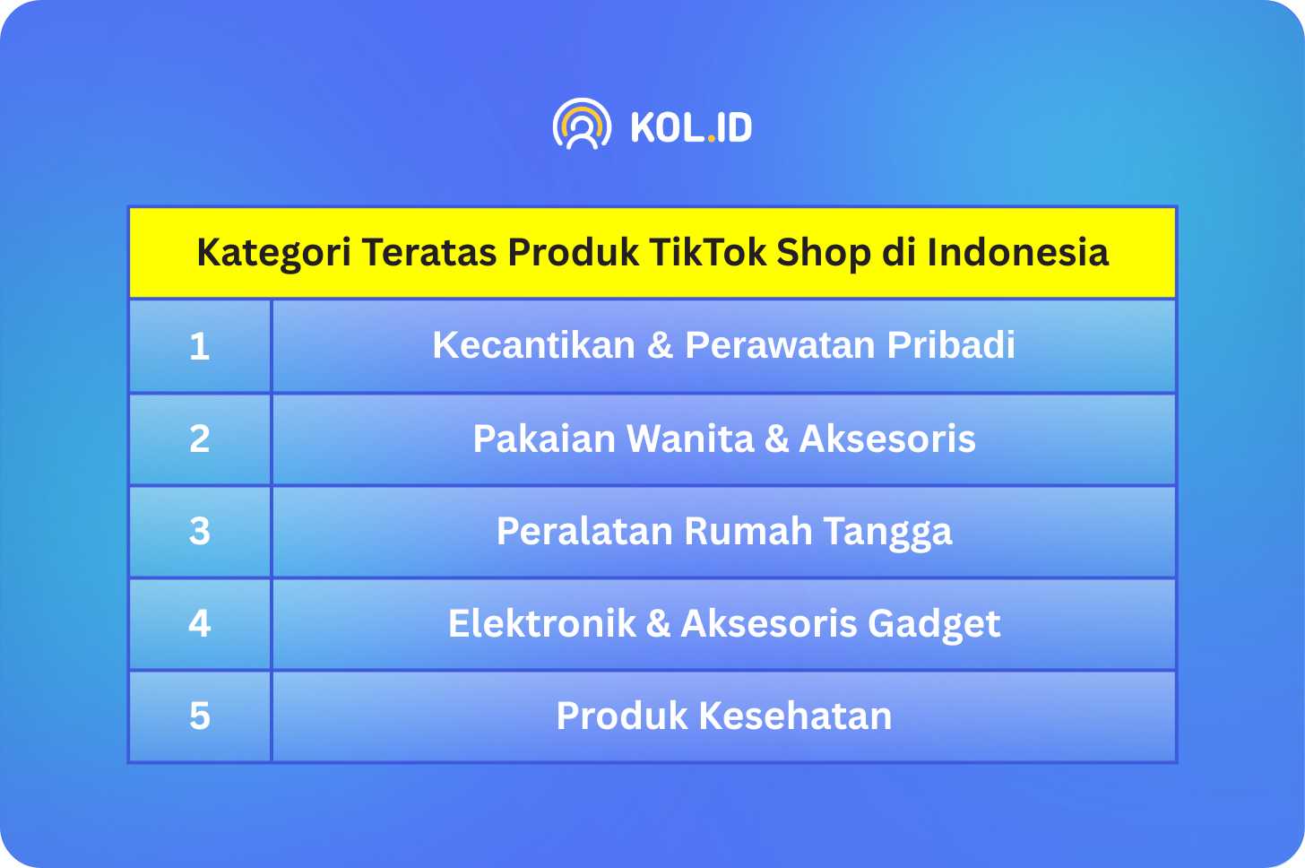Sekitar 9 dari 10 toko teratas di TikTok Shop berasal dari kategori kecantikan dan perawatan pribadi yang merupakan pasar dengan frekuensi pembelian sangat tinggi. Untuk lebih lengkapnya, berikut ini daftar kategori teratas produk TikTok Shop di Indonesia berdasarkan data dari Momentum Works.
