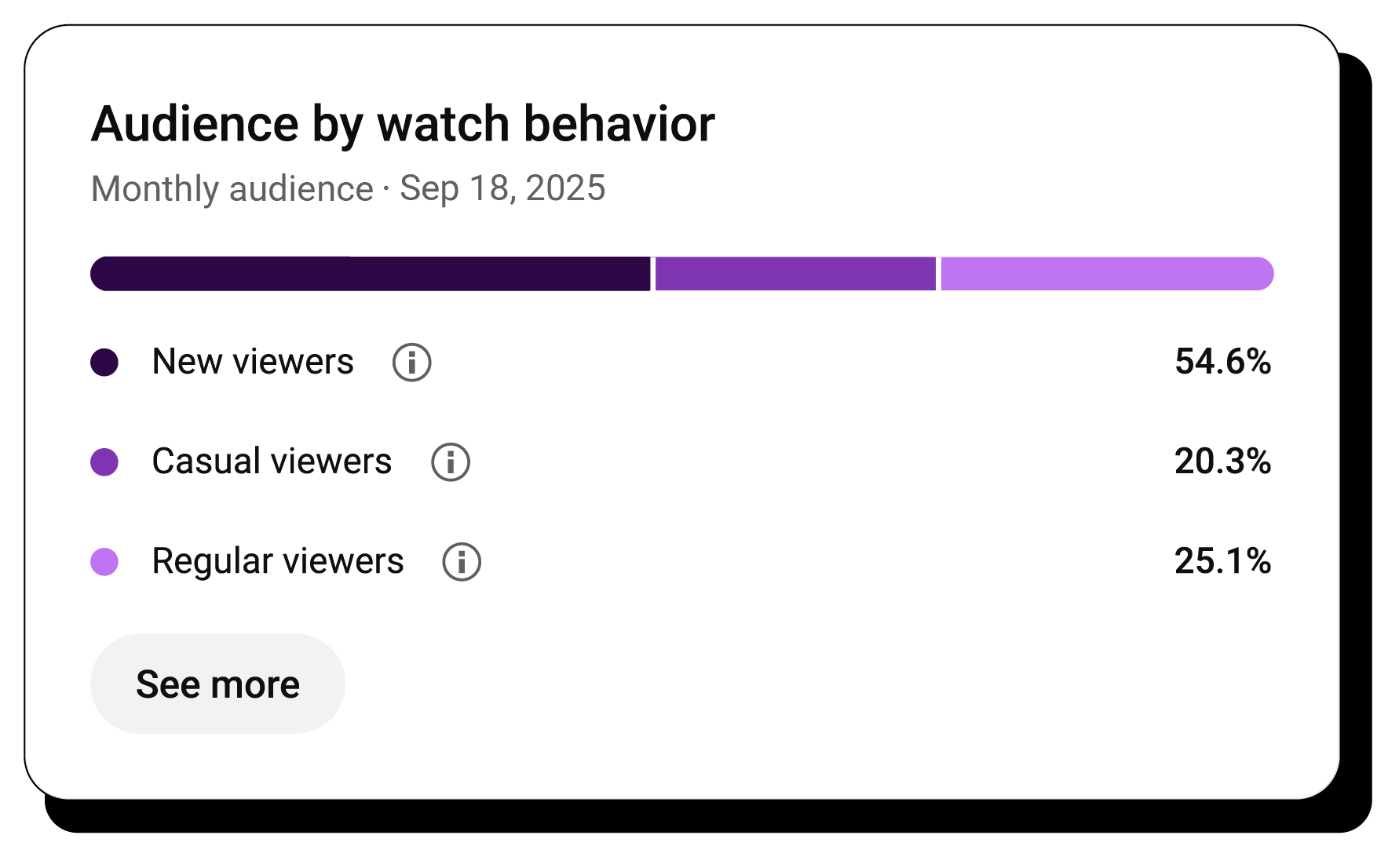 Dalam update terbaru, kategori tersebut dipecah menjadi dua subkategori baru, yaitu Casual Viewer dan Regular Viewers, sehingga kreator dapat melihat dengan lebih detail seberapa sering audiens mereka kembali menonton. Jadi, berikut beberapa kategori Viewer baru di YouTube Analytics: