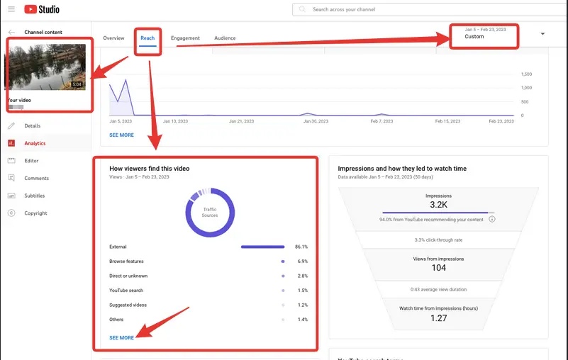 Sumber traffic viewers bisa dari Suggested (video rekomendasi YouTube), Search (hasil pencarian di YouTube), atau External (Berasal dari media sosial, situs dll), Direct or Unknown (buka langsung lewat notifikasi, bookmark, atau sumber yang tidak teridentifikasi).