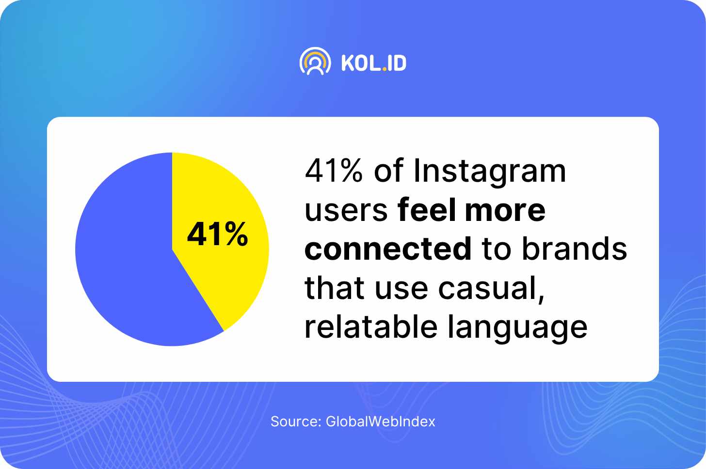 Menurut penelitian dari GlobalWebIndex, 41% pengguna Instagram merasa lebih terhubung dengan brand yang menggunakan gaya bahasa kasual dan relatable. Bahasa yang terlalu formal dianggap kurang personal.