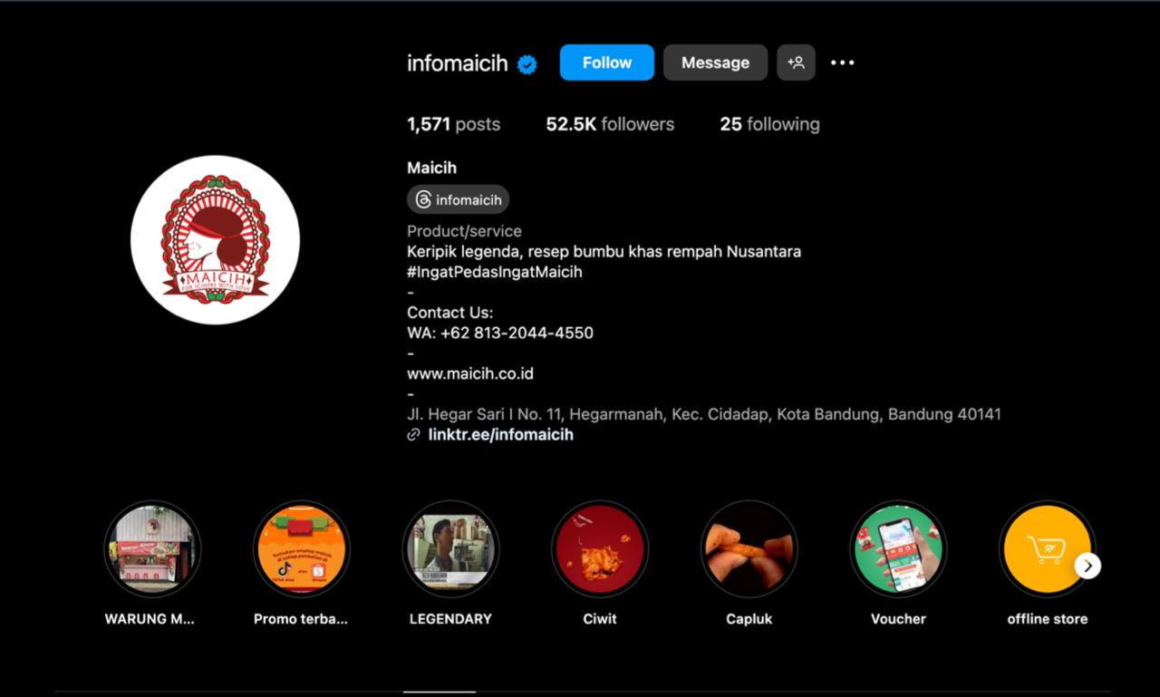 Pengguna Instagram biasanya hanya meluangkan waktu beberapa detik untuk melihat bio sebuah akun. Oleh karena itu, deskripsi yang ringkas, padat, tapi tetap jelas sangat penting agar pengunjung langsung memahami siapa dan apa yang ditawarkan. Lihat bio Instagram dari brand Maicih berikut ini:
