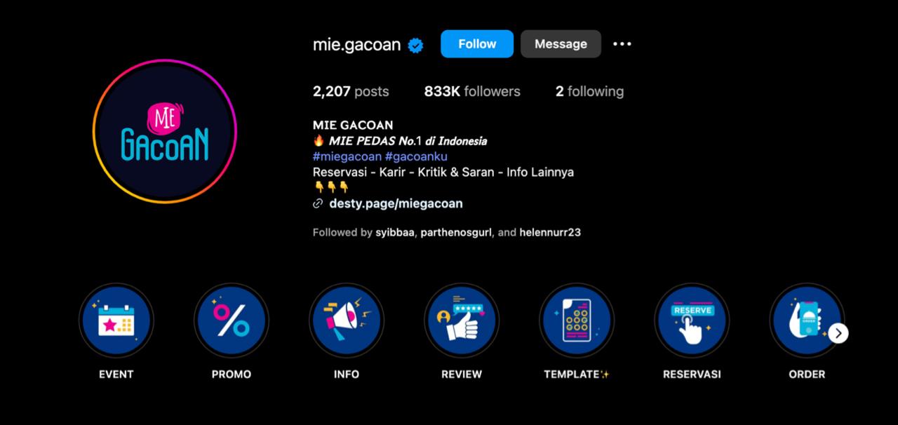 Misalnya Mie Gacoan dalam bio Instagramnya menggunakan CTA dalam bentuk link aktif ke desty.page/miegacoan, di mana audiens bisa langsung lihat lokasi cabang atau promo.