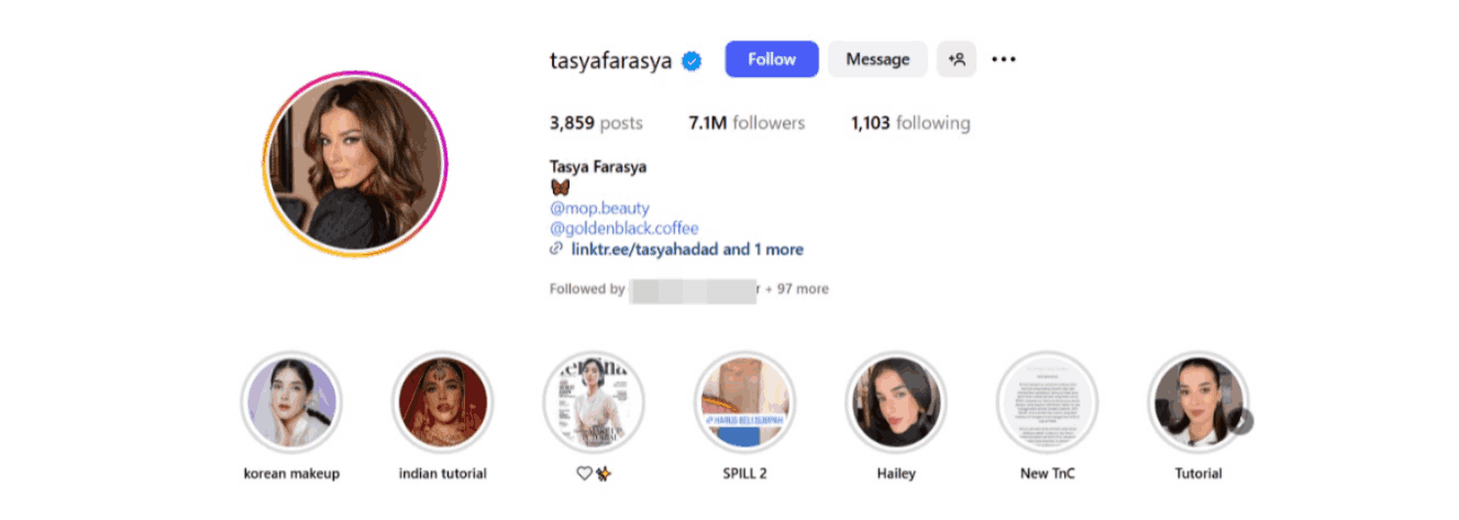 Instagram menjadi salah satu platform utama di mana bio link digunakan secara maksimal. Banyak influencer, selebriti, dan KOL memanfaatkan bio link untuk mengarahkan audiens ke media sosial atau halaman penting lainnya. Berikut contoh bio link influencer Tasya Farasya di bawah ini: