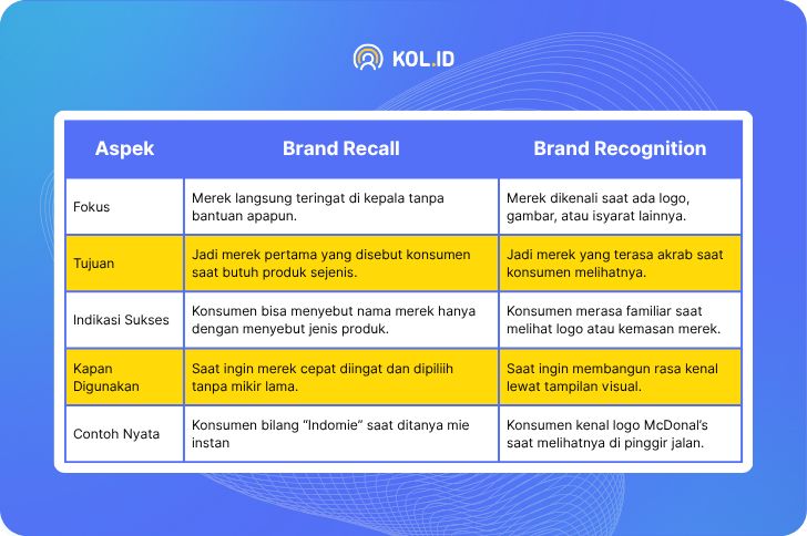 Sebaliknya, brand recall tidak membutuhkan pemicu visual. Konsumen bisa menyebutkan nama brand tanpa adanya petunjuk, hanya berdasarkan memori yang kuat terhadap brand tersebut. Table berikut akan membantu Anda memahami perbedaan keduanya secara lebih jelas: