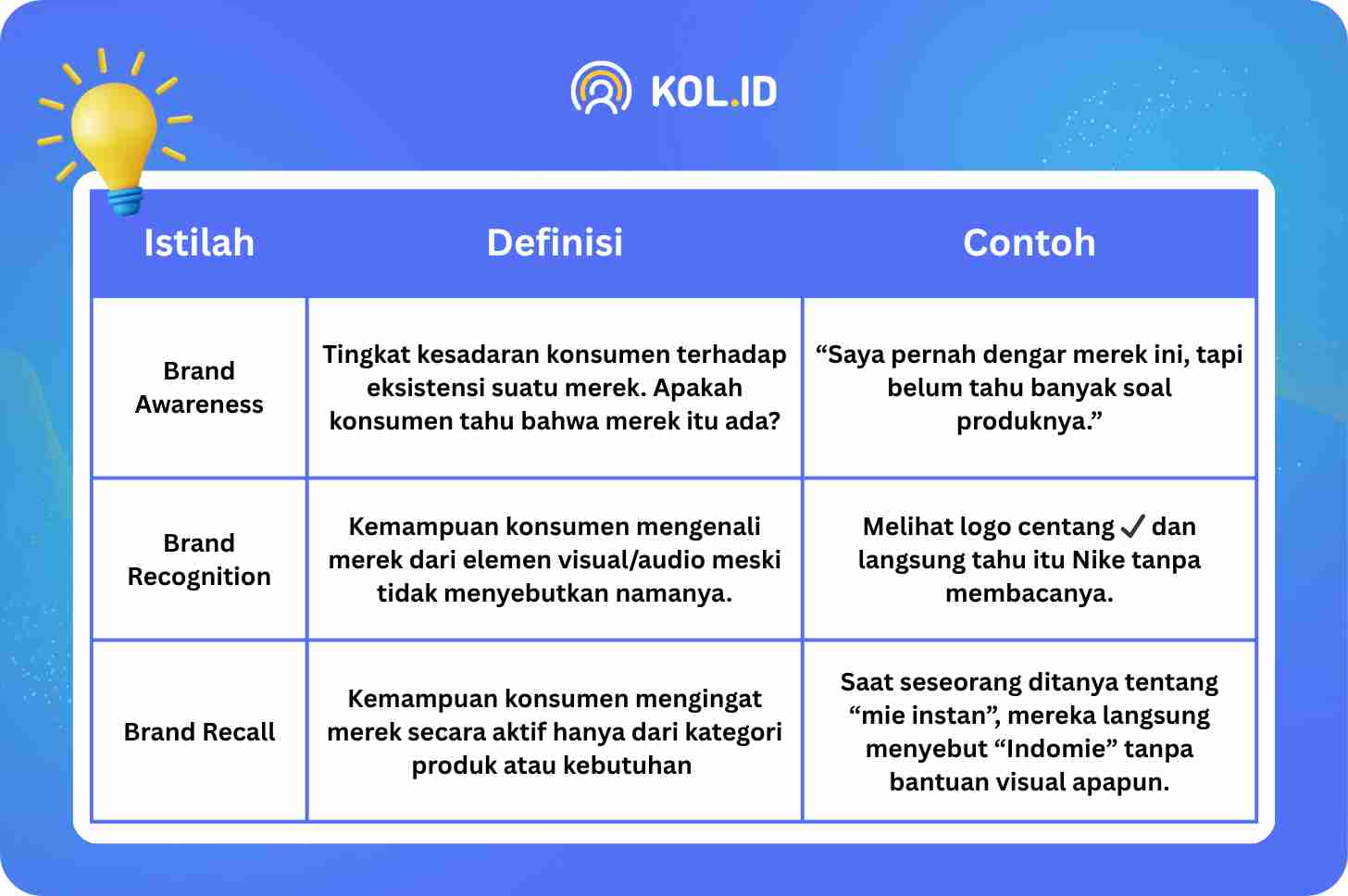 Ketiga istilah ini sering terdengar dalam dunia pemasaran, namun memiliki arti dan fungsi yang berbeda. Untuk lebih memahami perbedaan dari Brand Recognition, Brand Recall, dan Brand Awareness, simak table di bawah ini: