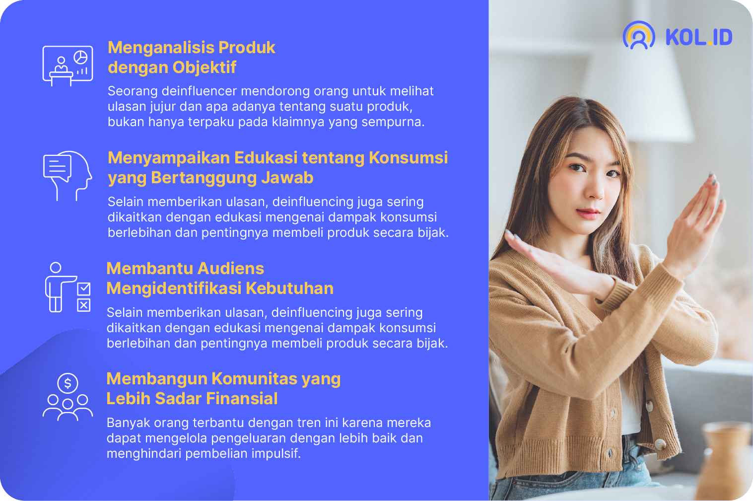 Jika brand memiliki produk berkualitas, deinfluencing bisa membantu membangun kepercayaan karena ulasan yang lebih transparan dan jujur akan memperkuat kredibilitasnya.